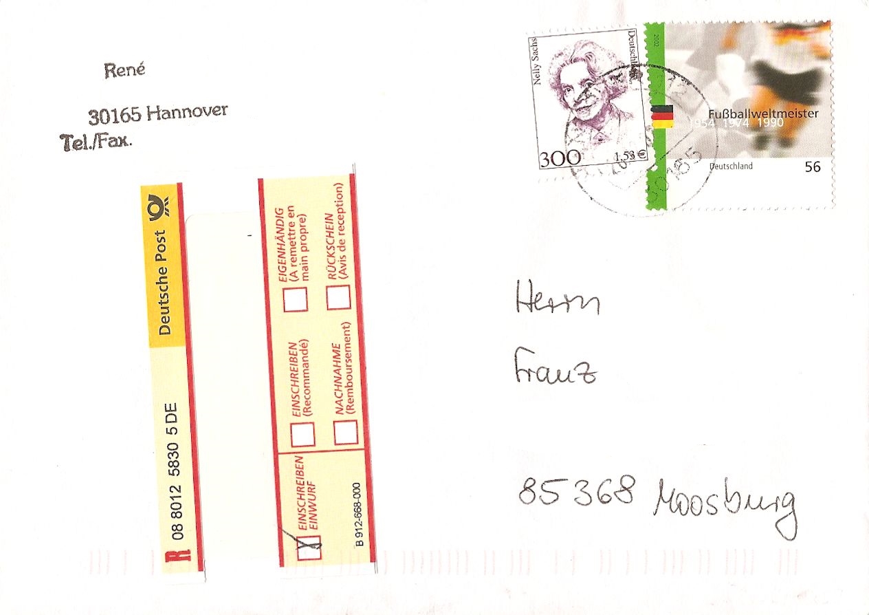 Ein Einschreiben vom 26.12.02, von Hannover nach Moosburg mit Zusatzleistung Einwurf-Einschreiben.