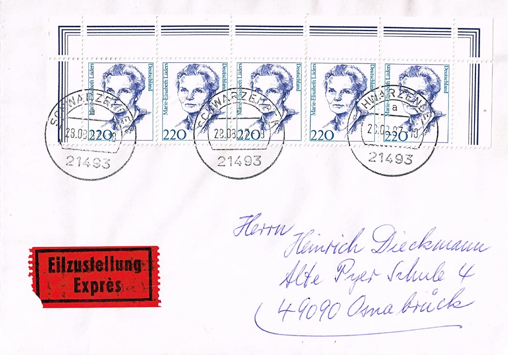 frankiert mit der oberen Hälfte eines 10er Bogens MiNr n1940 -Marie Elisabeth Lüders- 5x220 (1100)