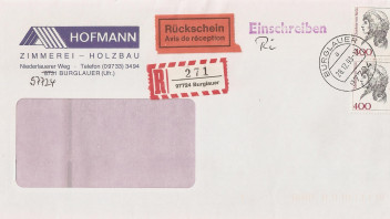 Frankiert mit 1* 20 Pf Aussem (1365) + 3* 100 Pf SWK (1406) + 3* 500 Pf Salomon (1397).