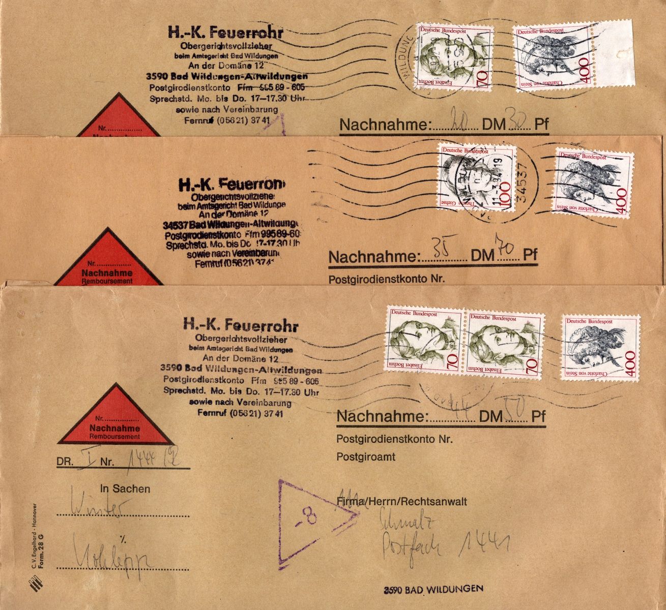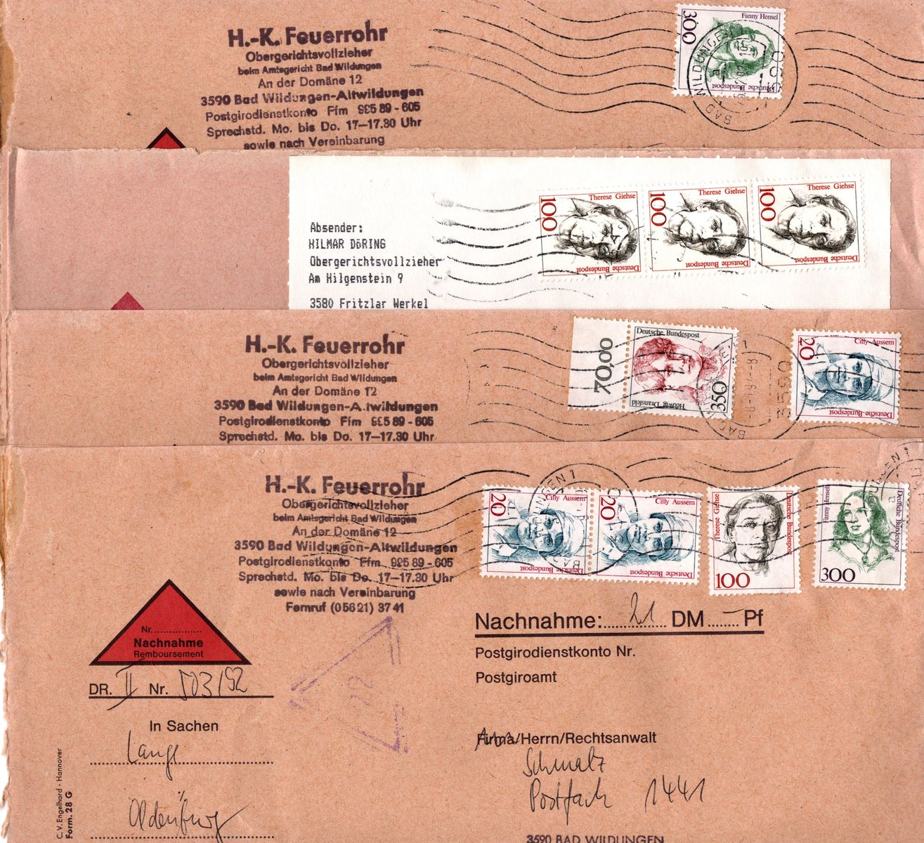 Alle Belege sind gelaufen innerhalb von Bad Wildungen in Nordhessen. Es handelt sich um Post von Gerichtsvollziehern an Rechtsanwälte.