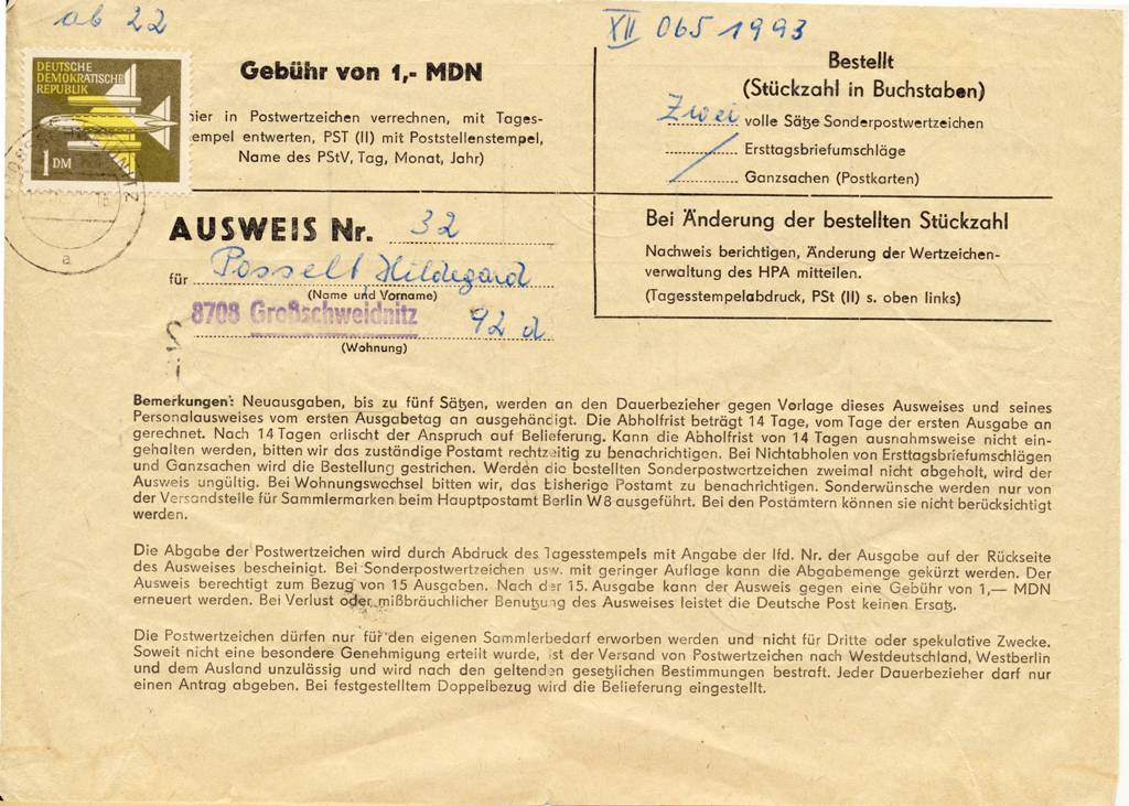in der ehemaligen DDR, gab es ja Ausweise, die den Kauf von Sonderpostwertzeichen ermöglichten, als Anhang ein Scan eines solchen Ausweises.
