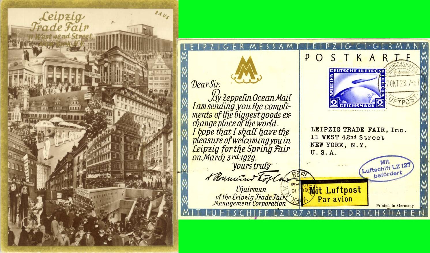 Die erste Karte wurde vom Leipziger Mess(e)amt als Werbung mit dem Zeppelin LZ 127 am 07.10. 1928 nach USA – angeblich 2.000 Stück – gesandt.