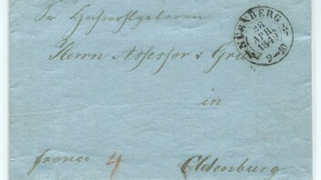 Für Bayern 6 Kr. bis Hof, 4 Sgr. = 14 Kr. für Preußens Transit und 15 Kr. für weitere Porti bis zum Empfänger (Transit- und Oldenburgporto).