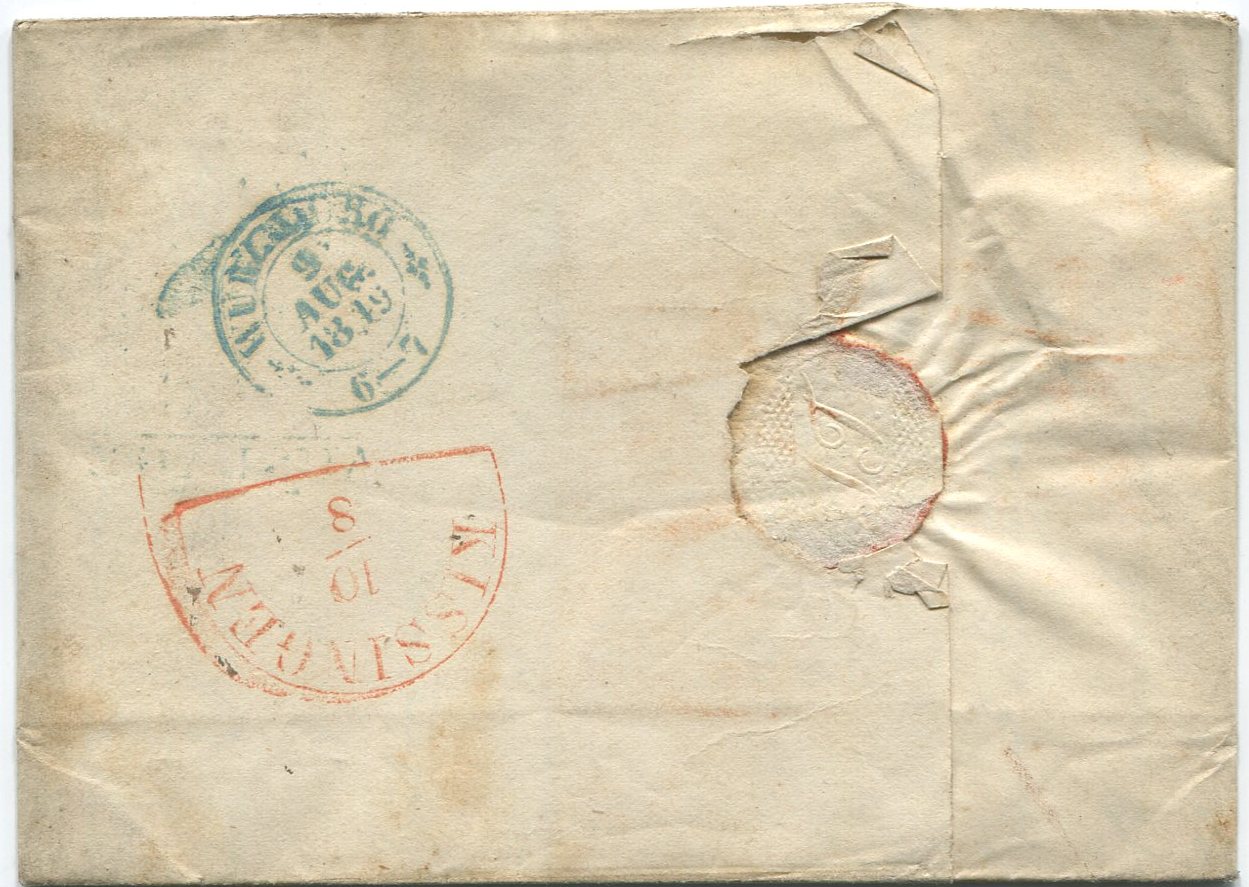 In Koblenz bekam der Brief dann den preuß. Ovalstempel "Bayern", mit dem Preußen ab 1838 die von außerhalb auf sein Postgebiet eingehenden Sendungen kennzeichnete.