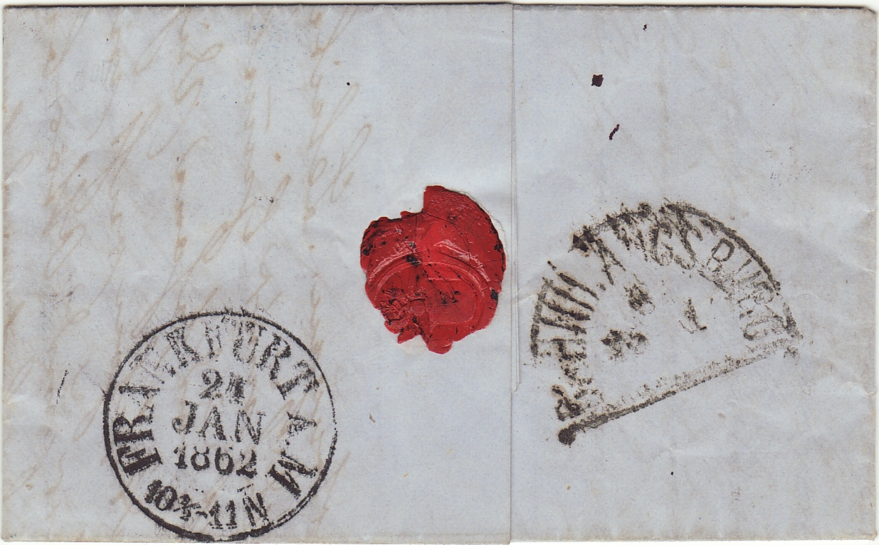 Siegelseitig ist ein Stempel von Frankfurt mit Datum 4.7. abgeschlagen. Als Ankunftsstempel fungiert ein Halbkreis von Lambrecht, der leider sehr schwach abgeschlagen ist. Den Dritten Stempel kann ich nicht deuten, vermute aber, dass es wiederum ein Bahnpoststempel ist.