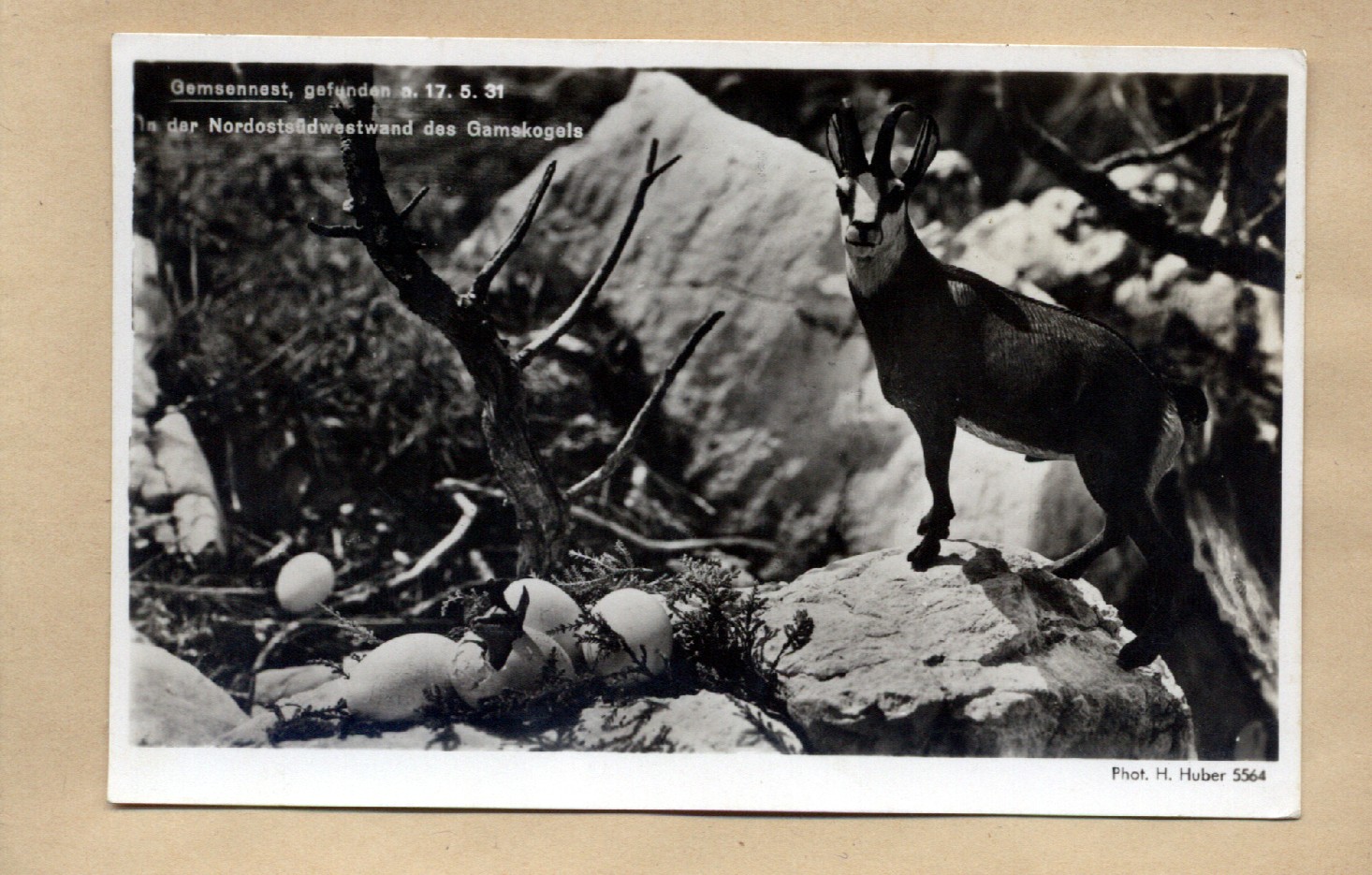Eine äußerst seltene Aufnahme von einem Gelege mit Gemsen-Eiern (seit der Rechtschreib-Reform heiß es Gämsen-Eier, aber nicht für mich!), aufgenommen 1931 am Gamskogel bei Mittenwald. Die Gemsenmutter lugt schon misstrauisch auf den Fotografen, um ihr Gelege mit allen Mitteln zu verteidigen.