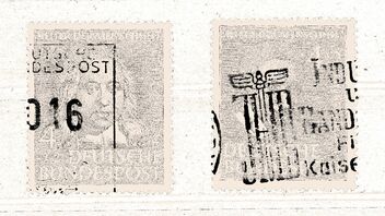 Habe aus meiner Sammlung mal 2 Marken rausgekramt mit dessen Stempeln ich nicht ganz klarkomme und wo bei mir noch Aufklärungsbedarf besteht, beim ersteren kann ich mir vielleicht noch erklären das dieser durch eine Freistempelmaschine gegangen ist bei der zweiten Marke meine ich ein Eisenbahnlogo zu erkennen.