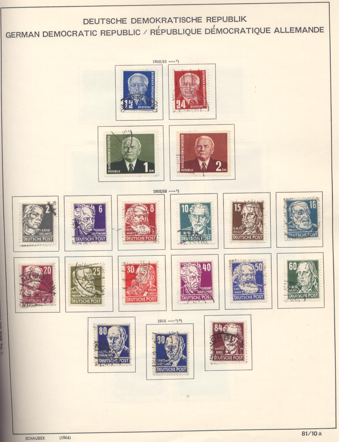 Es handelt sich Bund in 2 Schaubeck Vordruckalben DDR 1949 - 1990 in gestempelter Erhaltung. Also beim durchblättern fehlen 22 Marken. Also wenn einer Interese zeigt bzw. hat Mailen. Ich sende euch auf Wunsch gerne Bilder bestimmter Seiten.m Am besten Ihr könnt sie euch persönlich ansehen.