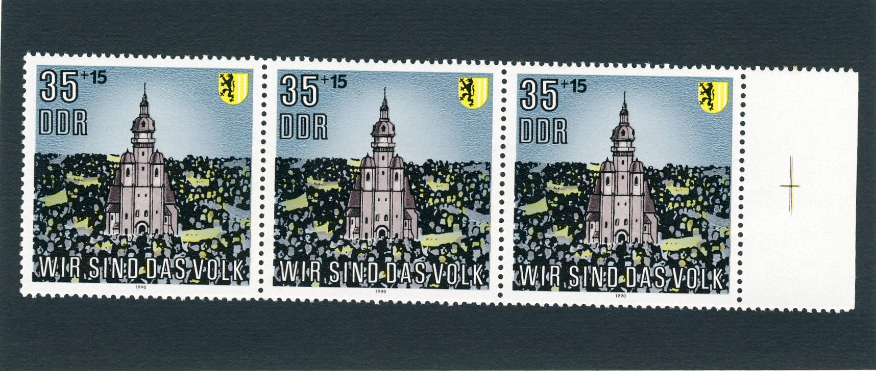 Ich bin im Besitz von drei zusammenhängenden DDR MiNr. 3315 mit Fehlfarbe Blau (siehe Scan). Im Michel-Spezial ist die Marke zwar unter 3315F gelistet, aber ohne preisliche Bewertung. Durch die fehlende Farbe fehlt u.a die Inschrift "Leipzig 1989" neben dem Stadtwappen.