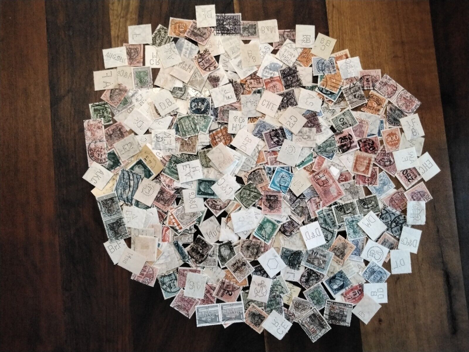 Dieser Haufen von Perfins, der gerade bei Ebay 103,50 EUR erzielt hat, ist sicher eine Fundgrube für Perfin-Sammler, die auf der Suche nach neuen Lochungen sind: