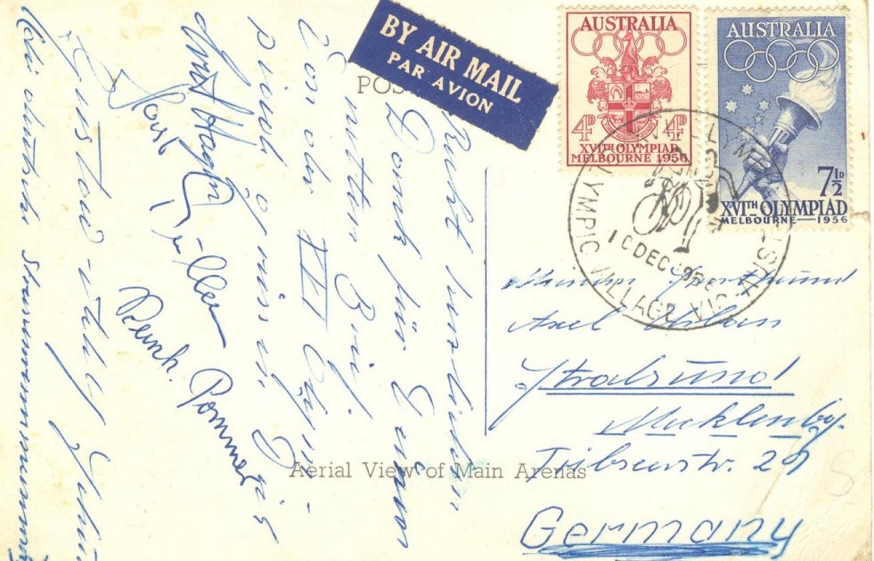 ich habe da eine Postkarte ausgegraben die ich vor längerer Zeit auf einem Flohmarkt erstanden habe. Geschrieben wurde sie von der XVI.Olympiade in Melbourne 1956. Die Olympiaausgaben von Australien und ein Stempel des Olymischen Dorfes sind auch drauf. Interessant finde ich das die Strassenradrennmannschaft um einen gewissen Gustav Adolf Schur (Täve Schur) auf der Karte unterschrieben hat. Für mich stellt sich die Frage ob ein solches Stück für einen Sport oder Olympiasammler einen gewissen Wert hat oder besser wie die Spezialisten auf diesen Gebiet so etwas bewerten. Vom reinen Markenwert glaube ich war es nicht so besonders. Den Stempel kann ich nicht einschätzen.