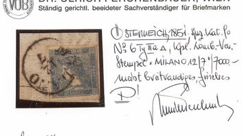 Eine andere Marke: bei der kommen mir fast die Tränen, ob der Erhaltung (rückseitig, wurde offensichtlich ein Falz unsanft abgerissen und dies hinterlies einen Riß bzw. ein Fenster). Unterlegte Mitte einer 3 Kreuzer Type I (wahrscheinlich Ia3, oder Ib) mit großem Plattenfehler im Adlerschwanz. Ewig schade...