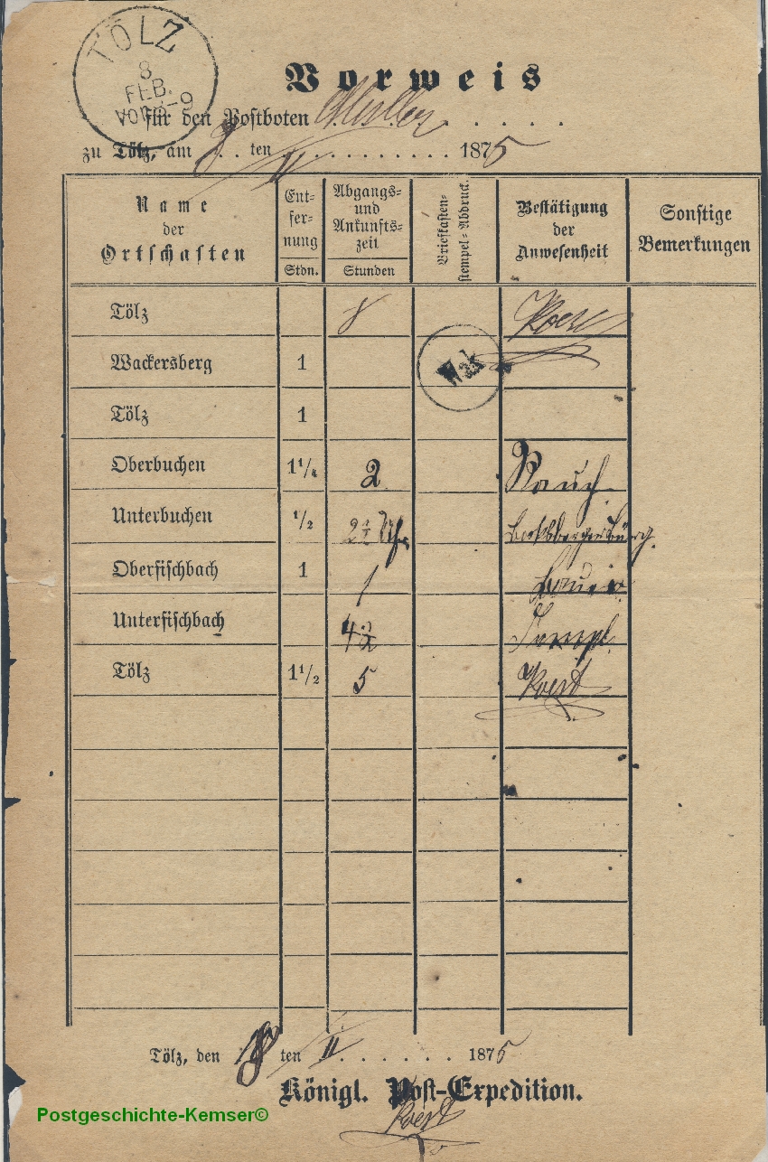 LBT sind in der Tat nicht häufig. Dennoch hatte ich das unverschämte Glück vor einigen Jahre zwei Landbrieträger-Vorweise (beide aus Februar 1875) zu bekommen, die alle im Landbestellbereich von Tölz verwendeten Landbriefträger-Stempel dokumentieren. :)