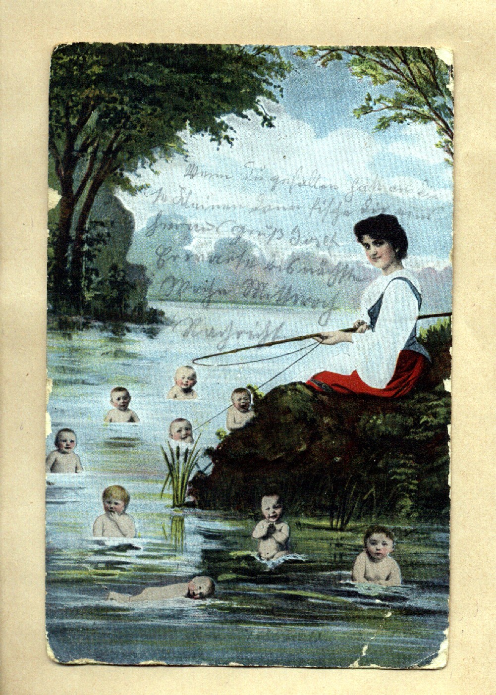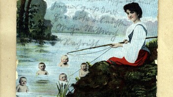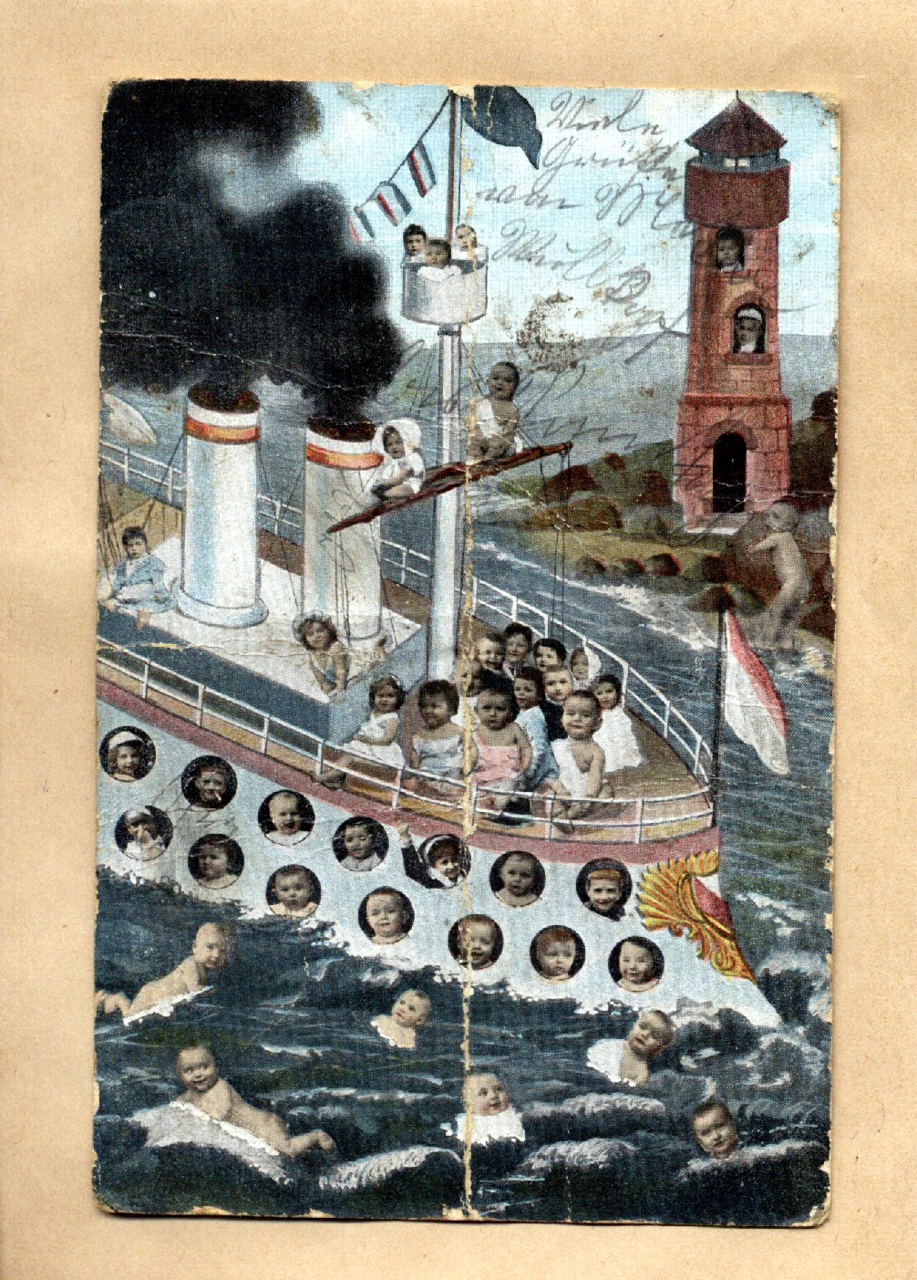 Früher wurden die kleinen Kinder anscheinend nicht durch den Storch gebracht, sondern entweder selbst aus einem Teich geangelt (alles tolle Schwimmer!) oder sie kamen auf einem Kreuzfahrt-Dampfer daher geschwommen (volle Belegung, sieht man an den Bullaugen)!