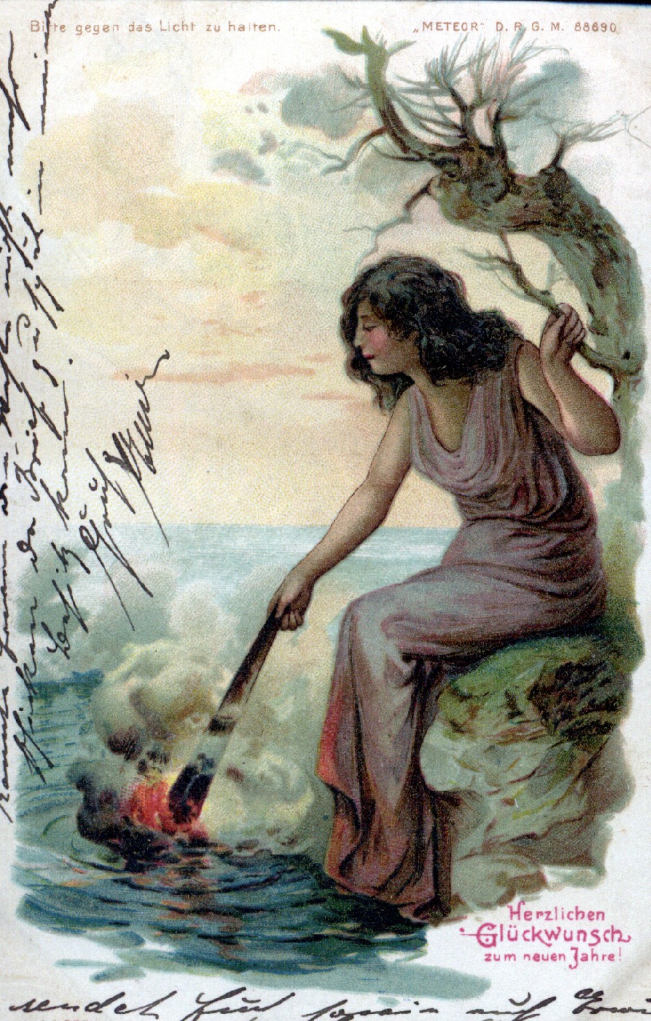 Hier noch pünktlich zum Neuen Jahr eine besondere Karte, abgeschickt am 31.12.1900. Wenn man der Aufforderung oben links folgt und die Karte gegen das Licht hält, erscheint über der Fackel ein Knabe in wallendem Gewande, der einer Muschel entspringt und eine Pergament-Rolle mit der Aufschrift: Prosit Neujahr! in den Händen hält.