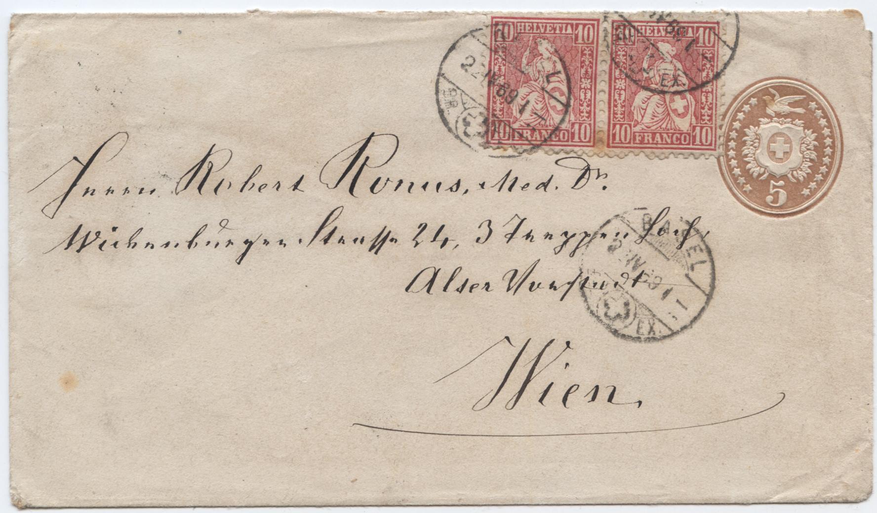 Der Brief ist von 1869 und ging von Basel mit Bahnpost Bern-Romanshorn nach Wien Josefstadt.