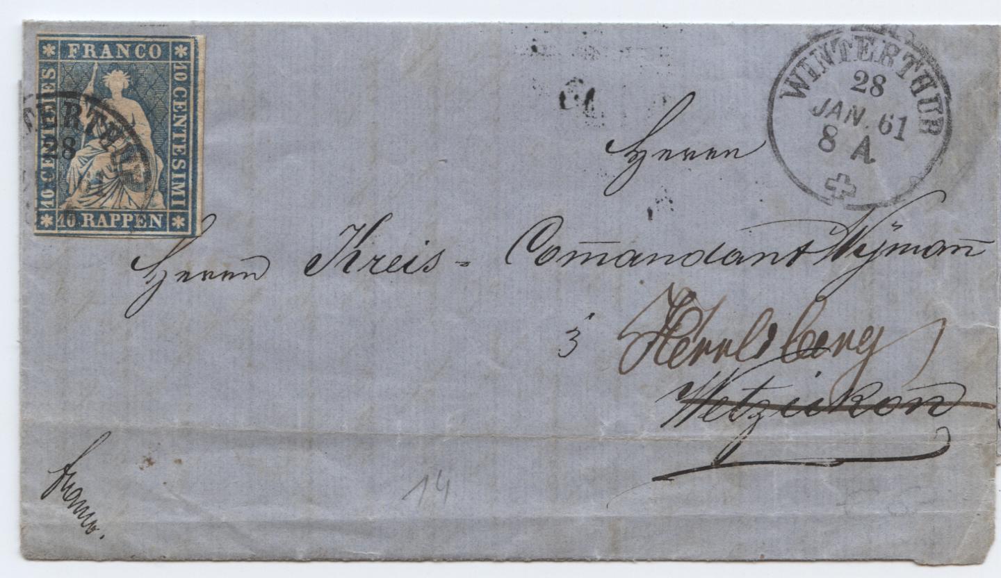 Der Brief selber ist dadurch interessant da er in Winterthur abging am 28.1.1861 Richtung Herrliberg in Zürich am 29.1. ankam von dort per Bahn Richtung Glarus in Herrliberg ankam und von dort den ganzen Weg wieder Retour ging.Anhand der Stempel schön zu sehen.