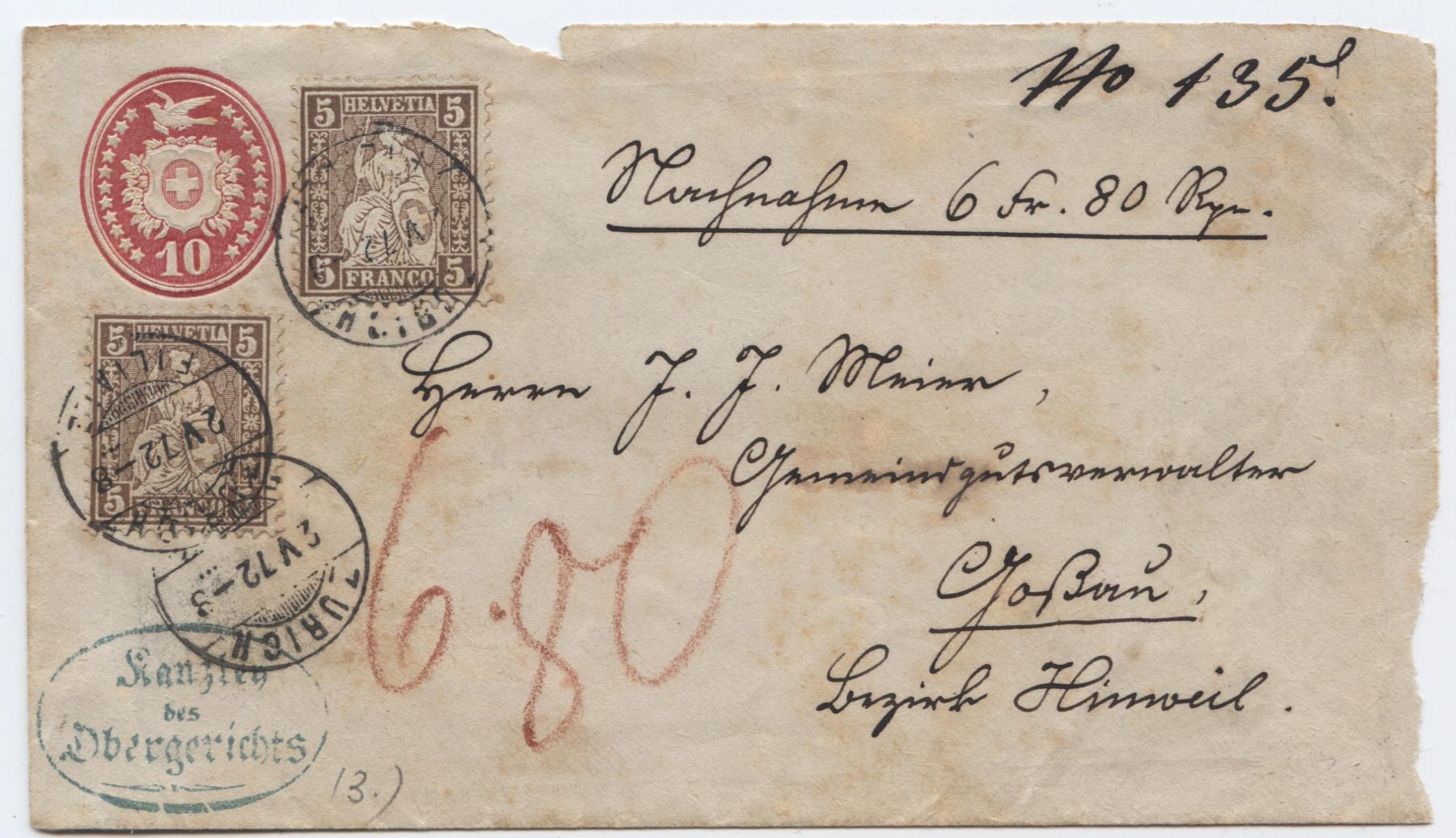 leider bloß eine Briefvorderseite eines Tüblibriefes Wert 10 Rappen mit entsprechender Zusatzgebühr für Nachnahmen von 10 Rappen von Zürich nach Hinwil.