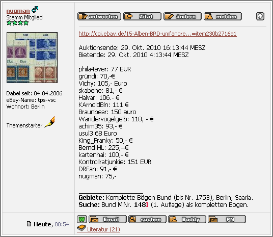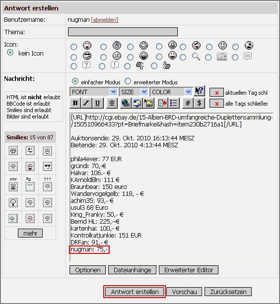 Jeder Bieter kopiert den Text des Bieters vor ihm mit der "Zitat"-Funktion, entfernt die QUOTE-Zeilen und ergänzt dann sein Gebot (genaue Beschreibung siehe unten). Der erste Bieter kopiert auch den Auktionslink und die Zeilen Auktionsende und Bietende.