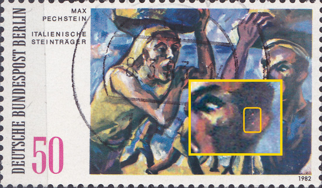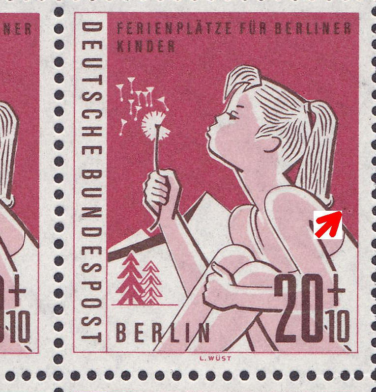 Hallo, ich begebe mich einfach einmal in einen anderen Bereich. Da ich auch ein große Dublettenbestand von Berlinmarken habe, habe ich heute einmal im Jahrgang 1970 gestöbert. Bei der Mi - Nr. 372 sind mir verschiedene Druckabweichungen aufgefallen. Einen Mehrfachfund stelle ich vor - Kleiner roter Punkt links neben dem Kopf der Tänzerin unterhalb des Punktes von "XX." Meine weiteren Funde unter