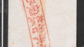 Ein undefinierbarer Beleg oder Brief Min-Chuh (office letter = Bürobrief) ohne Marken wird hier bei Ebay mit Startpreis von 31,90 EUR angeboten. Auf der Rückseite ein großer roter Stempel mit chinesischen Schriftzeichen.