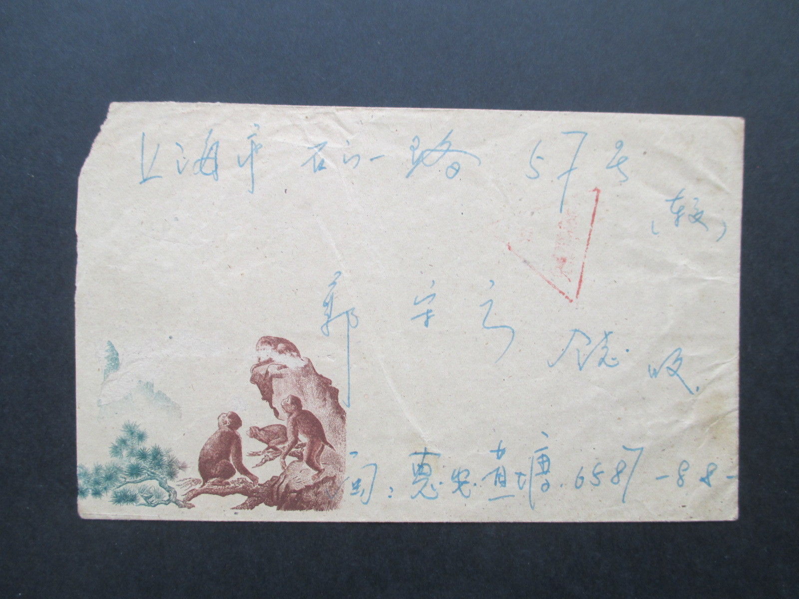 Militärpost aus China, ein Soldatenbrief mit einem nur sehr schwach abgeschlagenen roten Dreiecks-Stempel, wird hier bei Ebay für 150 EUR im Sofortkauf angeboten. Geschmückt ist dieser an einer Ecke beschädigte Brief auch noch mit einigen Affen.
