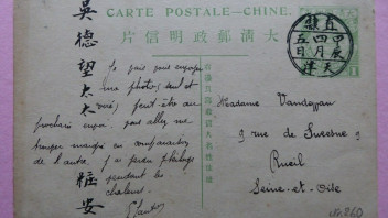 Bei "Fortsetzung der Sammlung" denkt man an die handschriftliche Numerierung der beiden China-Karten (Nr. 60 und Nr. 88). Da hat wohl jemand aus Frankreich sehr viele Karten früher aus China erhalten. Anscheinend ist diese Riesen-Sammlung aus einem Nachlaß nicht an nur einen Erben gegangen, da die beiden Karten von zwei verschiedenen Verkäufern bei Ebay eingestellt wurden.
