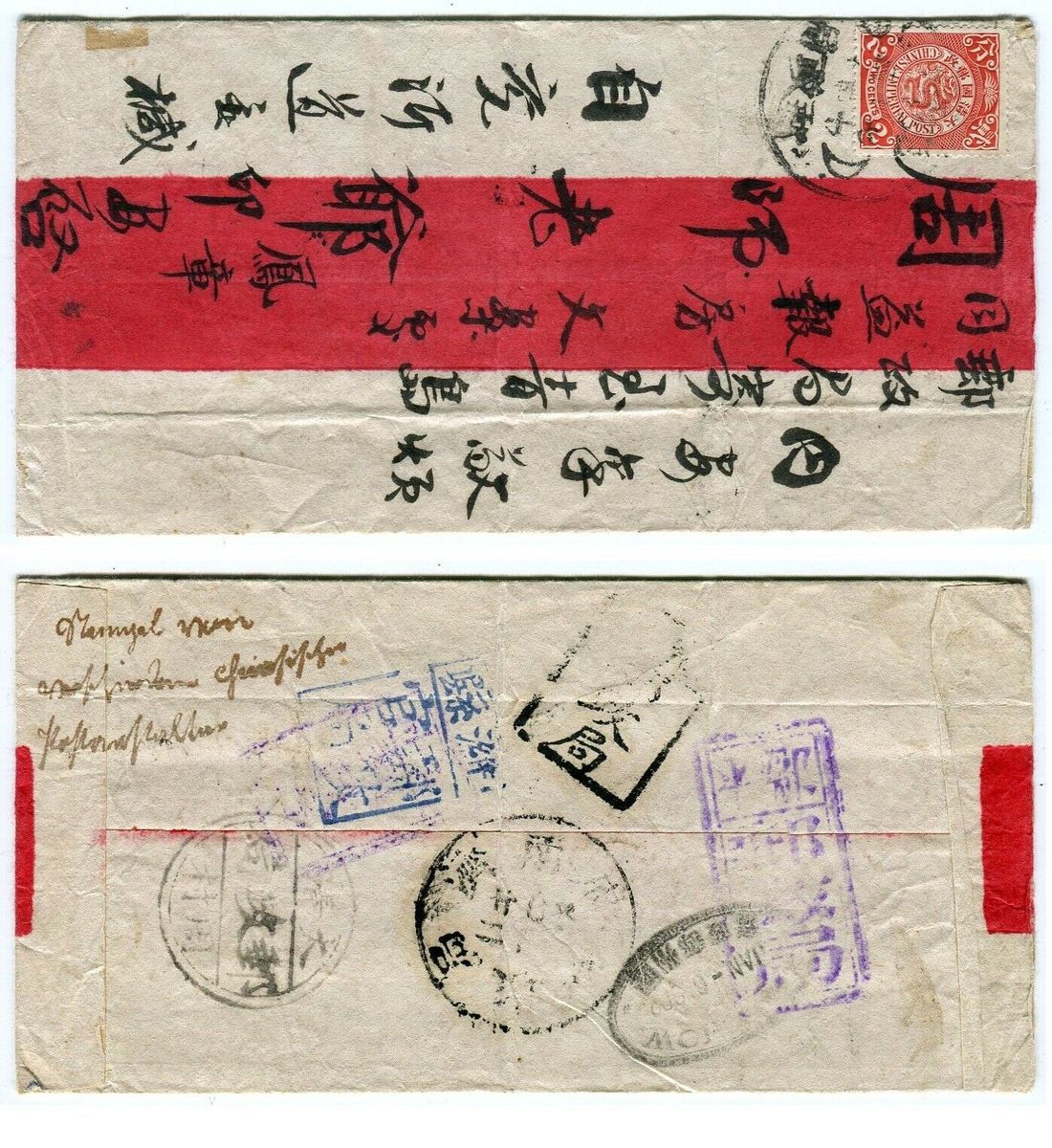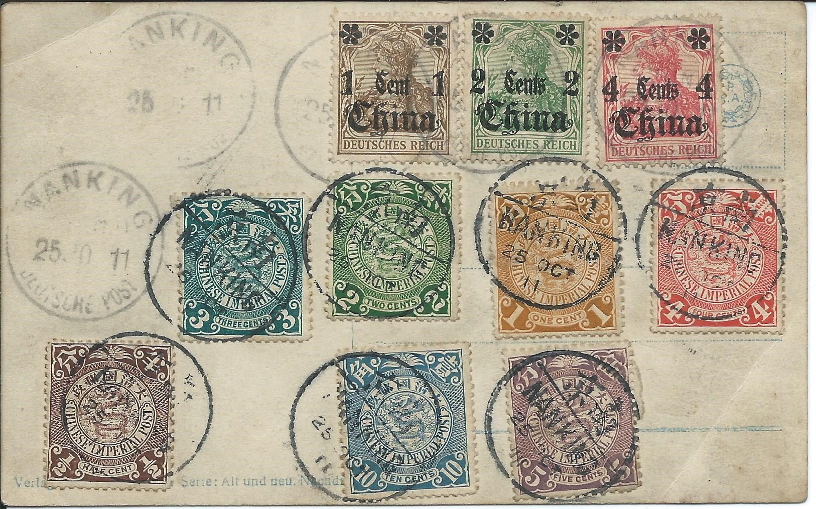 Habe in meiner PK-Sammlung eine alte Postkarte aus Nanking ohne Zustelladresse mit Frankaturstempel von 1911.