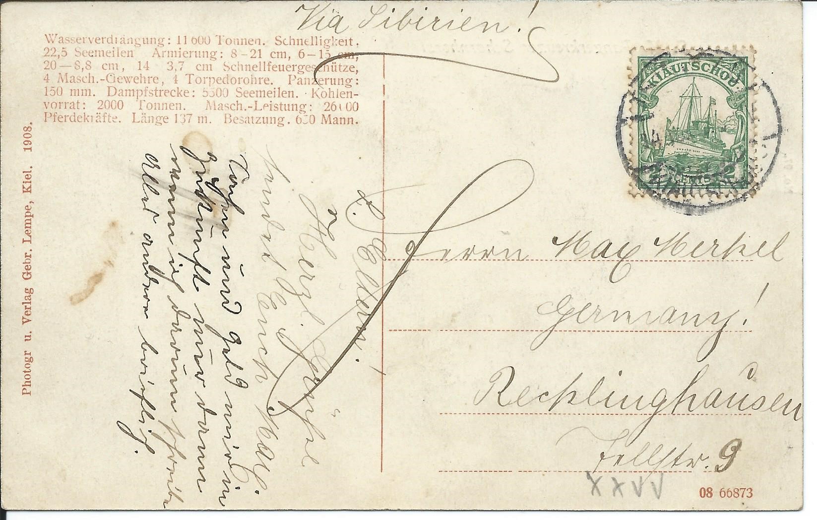 Die S.M.S Scharnhorst habe ich auch noch, aber mit Kiautschou Briefmarke.