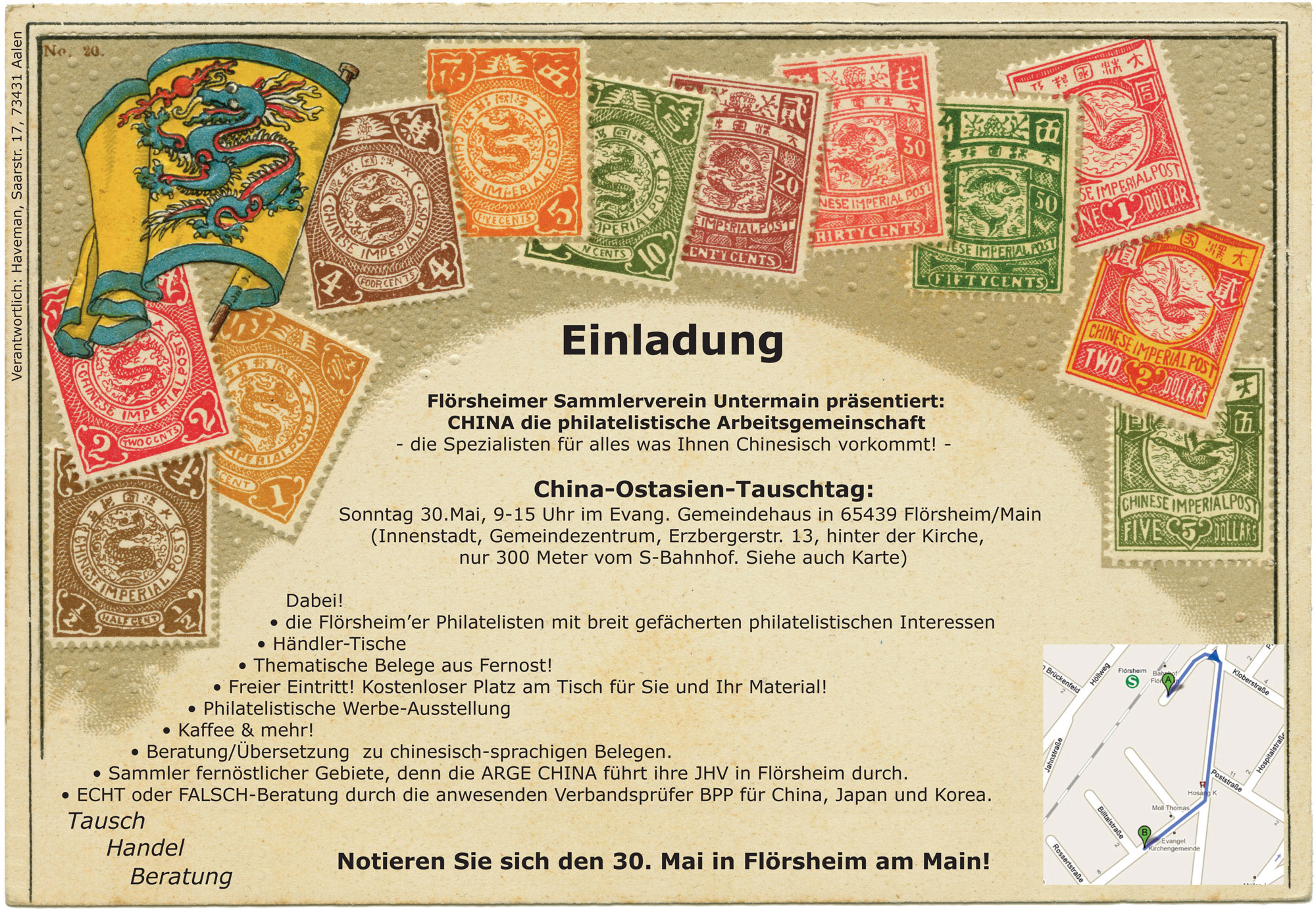 Alle die mal Lust haben den chinesischen Marken-Markt aus erster Hand zu erleben, eine schöne Ausstellung zu sehen und auch mal Händler, Fachleute und Sammler persönlich kennen zu lernen, würde ich gerne zu dieser Veranstaltung einladen: