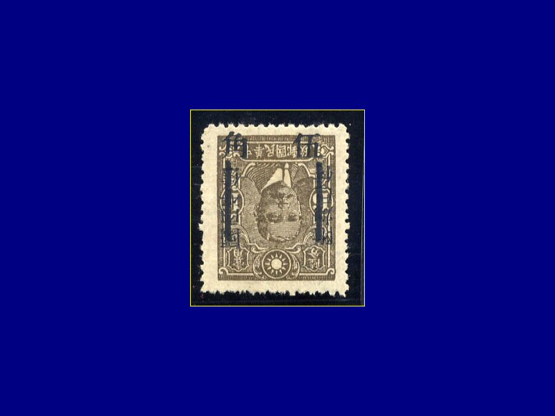 Das könnte die Michel-Nr. 498 von 1943 sein, 50 Cent auf 16 Cent olivbraun mit Provinz-Aufdruck von Yunnan. Was die aber mit kopfstehendem Aufdruck wert ist?