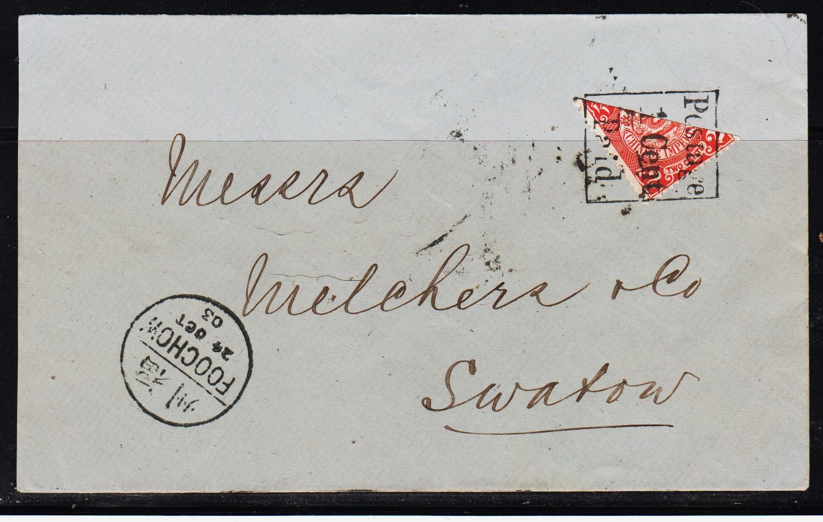 Ein chinesischer Inlandsbrief von Foochow nach Swatow mit einer halbierten Briefmarke erzielte bei Ebay nach 33 Geboten einen hohen Preis von 805,- EUR.