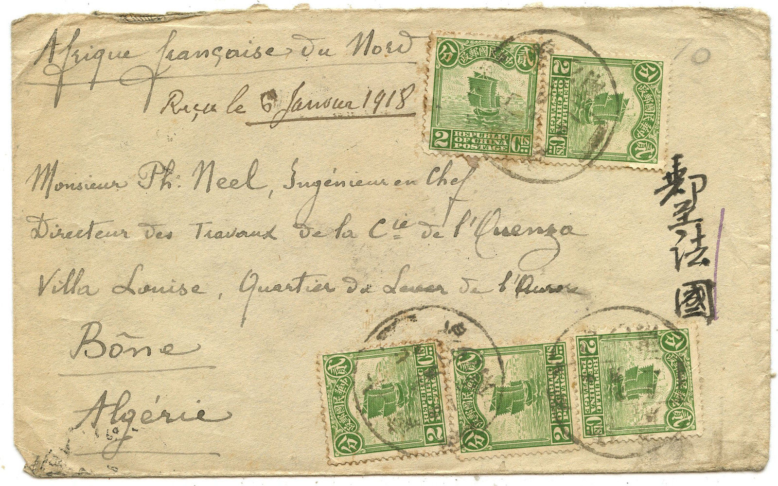 Dieser auf den ersten Blick etwas unscheinbare Brief von Peking-Moukden nach Bone in Algerien über Sinanfu aus dem Jahre 1918 erzielte am Ende 750,- EUR. :O_O: