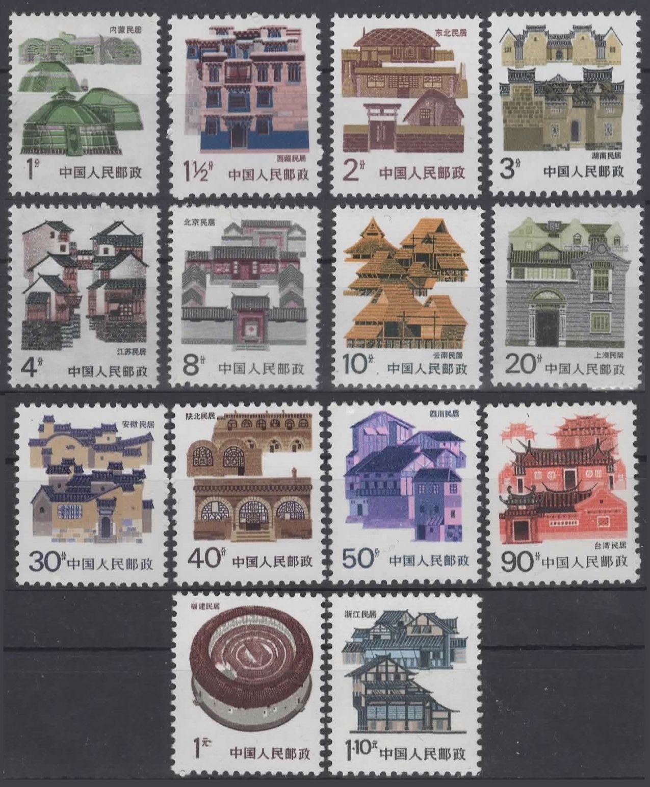 Die Marken habe ich jetzt gefunden. Es handelt sich um die Michel-Nr. 2070 von 1987/90, 1 Yuan aus der Freimarkenserie: Hausformen in den chinesischen Provinzen, die Provinz ist hier: Fujian. An eine Hausform hätte ich bei dieser Marke nie gedacht, sondern eher an eine Käsesahnetorte. :)