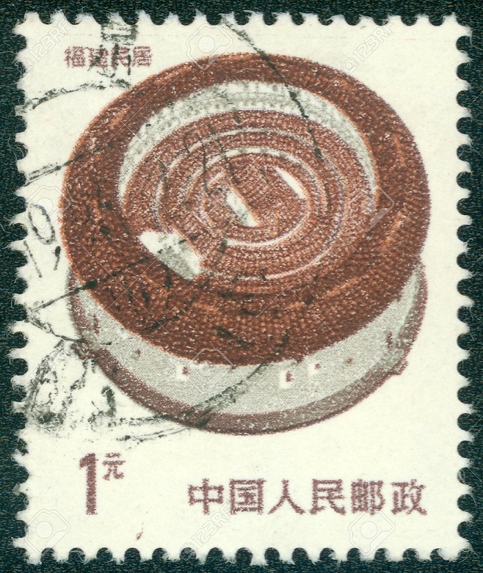 Die Marken habe ich jetzt gefunden. Es handelt sich um die Michel-Nr. 2070 von 1987/90, 1 Yuan aus der Freimarkenserie: Hausformen in den chinesischen Provinzen, die Provinz ist hier: Fujian. An eine Hausform hätte ich bei dieser Marke nie gedacht, sondern eher an eine Käsesahnetorte. :)