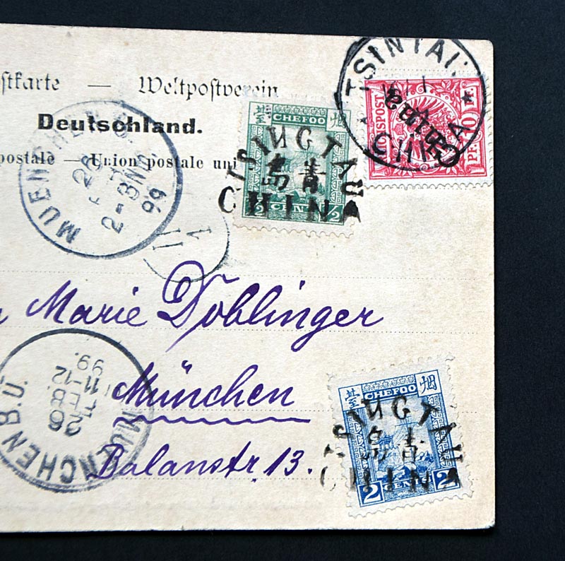 1. Tsingtau-Stempel in 2 Schreibweisen: Auf der deutschen Marke steht Tsintau, auf der chinesischen Marke Tsingtau mit einem vekehrten "N".