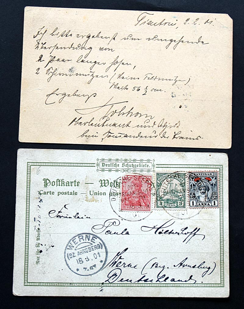 2. Auf einer afrikanischen Ansichtskarte befinden sich drei verschiedene Ländermarken: Deutsche Reichspost, Deutsch-Ostafrika und Zanzibar. Wie kommt so eine interessante Mischfrankatur zustande? Allein dieser Belegt ist wohl sehr wertvoll!