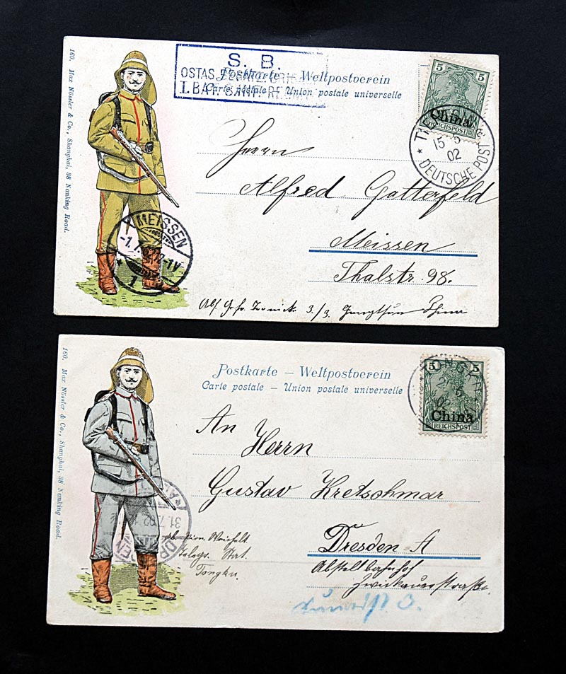 Eine attraktive Einschreibe-Karte wird da gerade bei Ebay angeboten, von Hankow versandt (gehört heute zu Wuhan, mit Stempel Schanghai Deutsche Post (auf der Rückseite), einem Hankow-Stempel mit Inschrift: I.J.P.O. (Weiß jemand, was diese Abkürzung bedeutet?) und diversen Marken und Stempeln von China, Hongkong, russischen und französischen Aufdrucken auf China-Marken, ein etwas verwirrendes Durcheinander, aber sehr schön anzuschauen. Auf der Rückseite der Karte ist zu lesen: "Gratuliere zum goldenen Bärenschilde". Scheint eine Art Auszeichnung oder Pokal zu sein, weiß da jemand Näheres dazu?