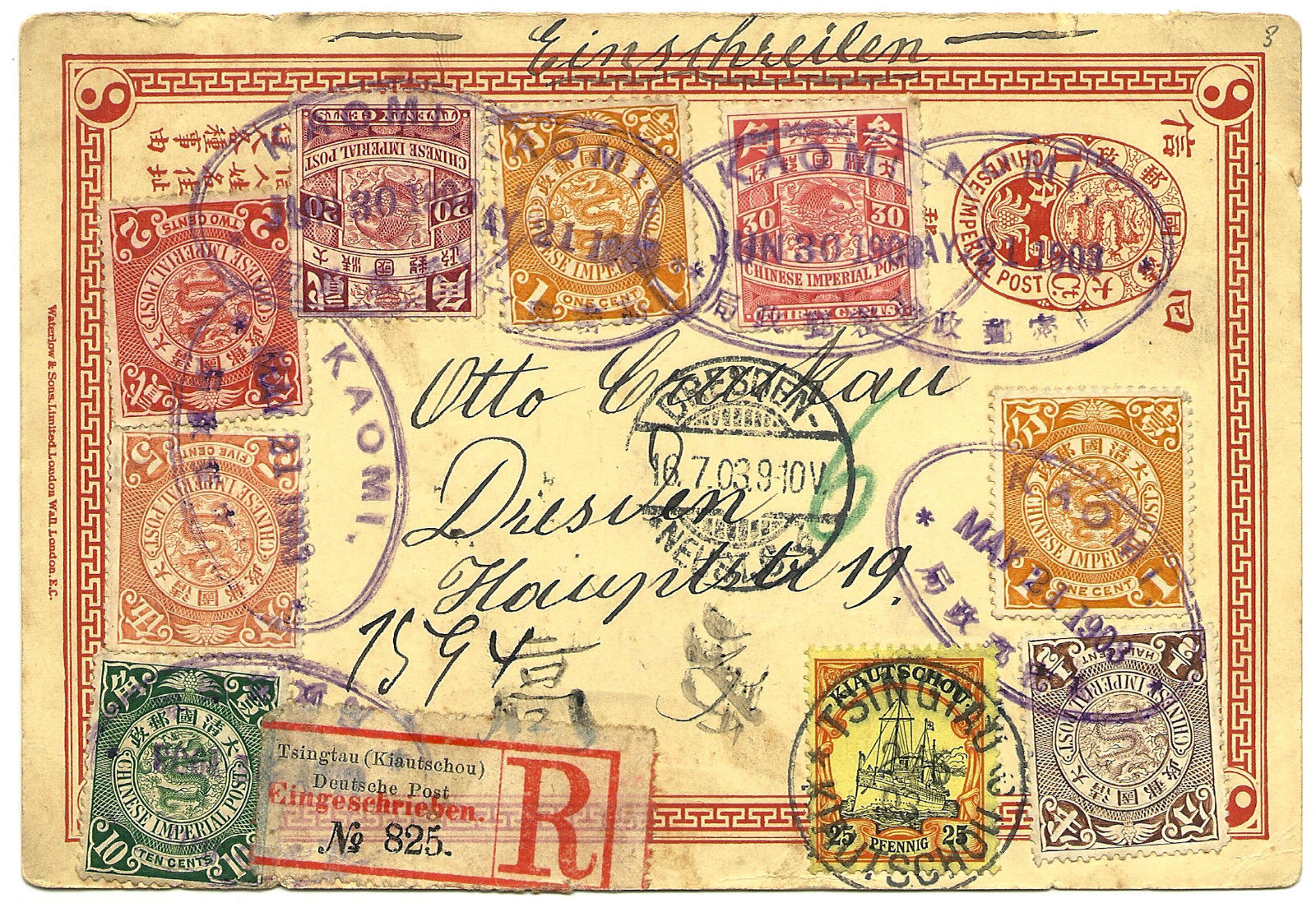 Eine interessante China-Ganzsache mit vielen Zusatz-Briefmarken zur Auffrankierung, optisch schön bunt anzusehen, wird hier bei Ebay für 725,- EUR als Auktion bzw. für 1.015,- EUR als Sofortkauf angeboten. Auf der einzigen deuschen Kolonial-Marke trägt sie den Stempel Tsingtau-Kiautschou, auf den 8 chinesischen Marken und dem Ganzsachen-Werteindruck ist jeweils ein großflächiger Stempel von Kaomi aufgedruckt. Die Datumsangaben auf den chinesischen Marken irritieren etwas. Während einige Stempel das Datum 21. Mai 1903 aufweisen, steht auf anderen Stempeln seltsamerweise das Datum 30. Juni 1903?