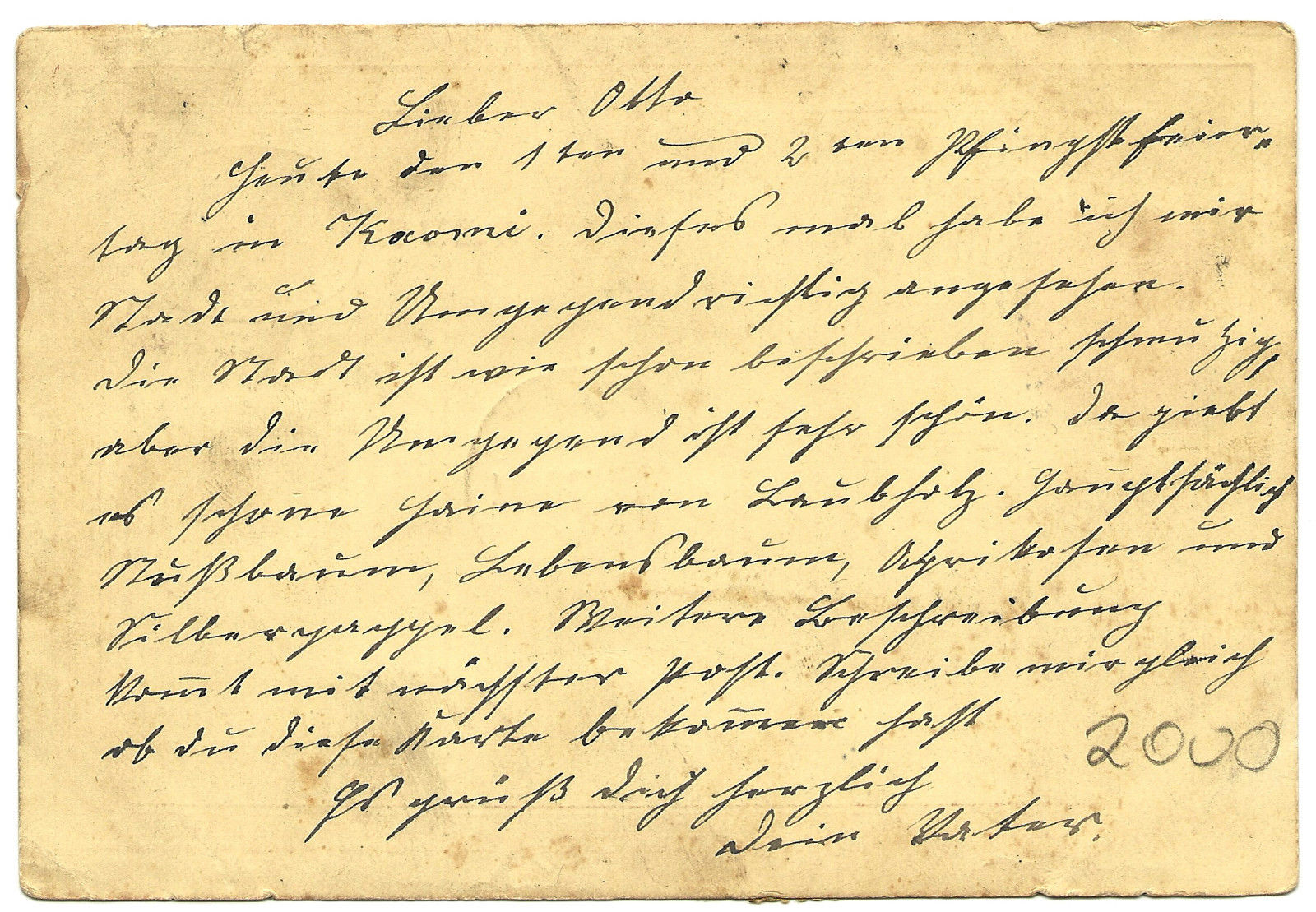 "Ich schicke Ihnen [euch] vielleicht beim nächsten Versand mein Photo (allein und gedreht). Sie [Ihr] werdet mich im Vergleich zum anderen Mal schlank [mager] finden. Ich habe während der Hitze sieben Kilogramm verloren. [Unterschrift]"
