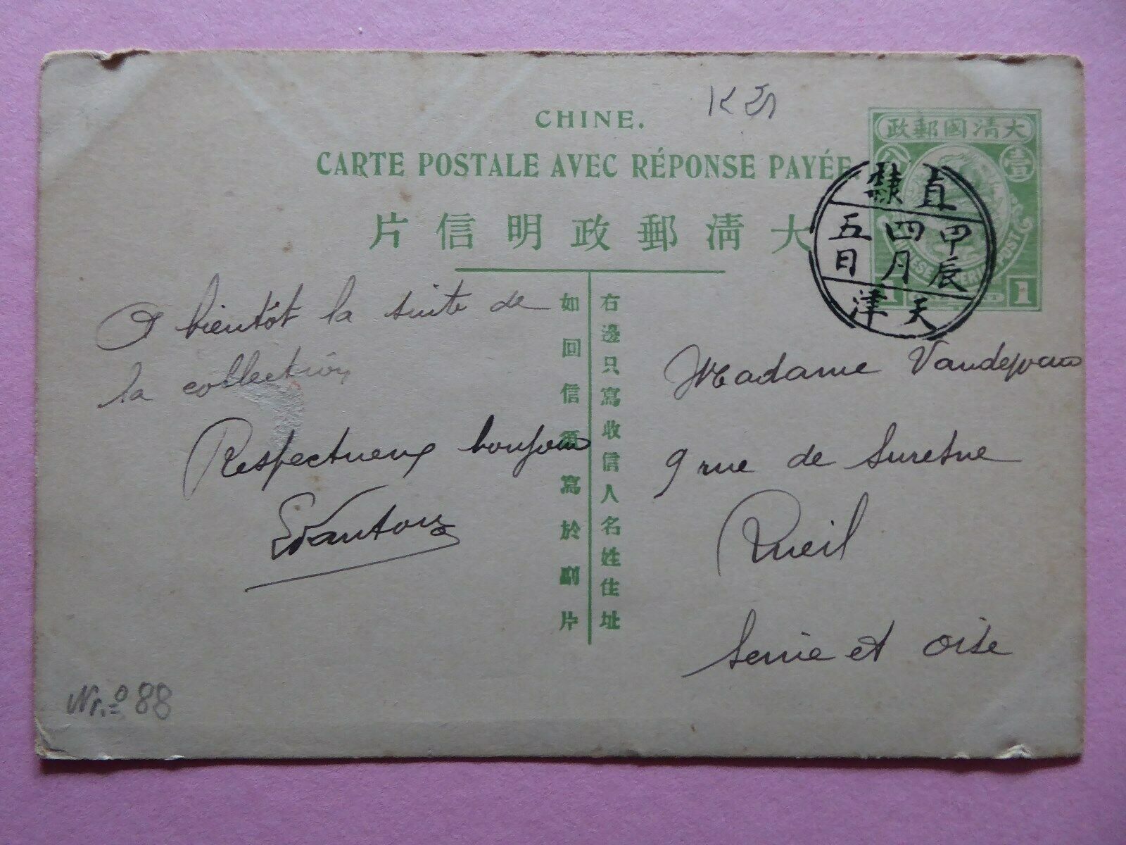 Bei "Fortsetzung der Sammlung" denkt man an die handschriftliche Numerierung der beiden China-Karten (Nr. 60 und Nr. 88). Da hat wohl jemand aus Frankreich sehr viele Karten früher aus China erhalten. Anscheinend ist diese Riesen-Sammlung aus einem Nachlaß nicht an nur einen Erben gegangen, da die beiden Karten von zwei verschiedenen Verkäufern bei Ebay eingestellt wurden.