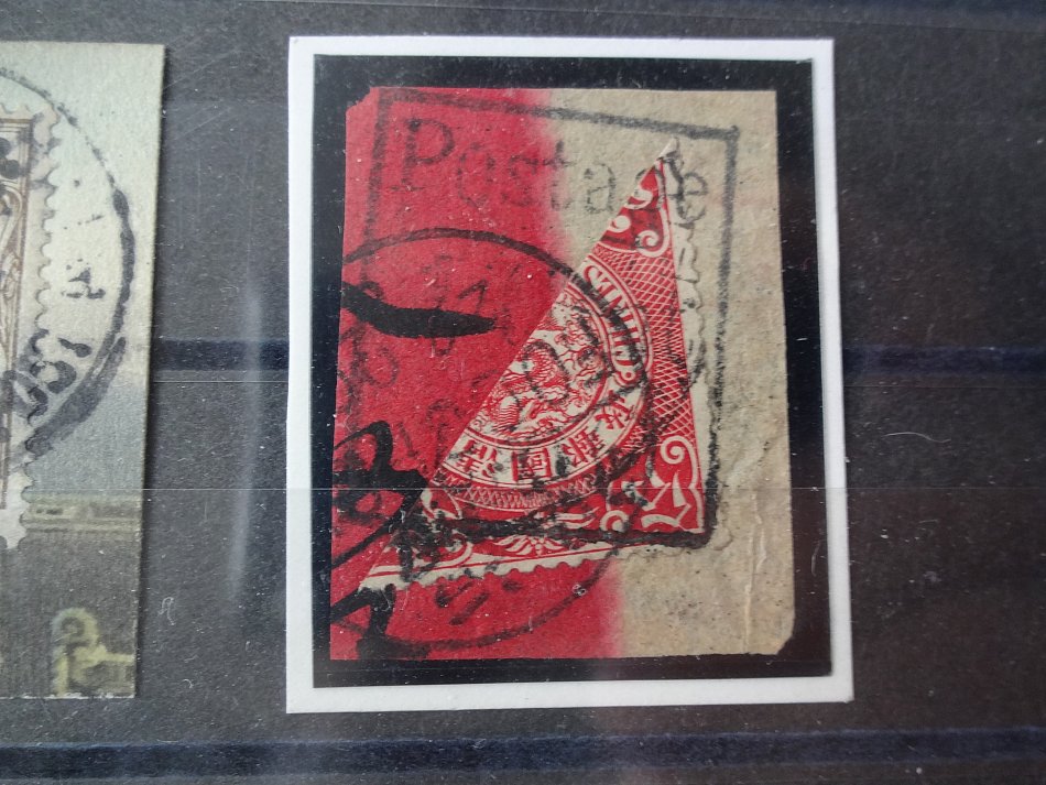 2. Halbierungen der China Michel-Nr. 49 waren 1904 bzw. 1906 in China möglich. Da gibt es die Michel-Nr. II Chungking-Provisorium von 1904 und die Michel-Nr. III Changsha-Provisorium von 1906. Dazu schreibt der Michel: Eine wirkliche Echtheitskontrolle dieser Michel-Nummer, die nicht an das Publikum abgegeben wurden, ist nur auf Ganzbriefen möglich. Da die Halbierung nur auf einem Briefstück ist, kann dies wohl auch nicht geprüft werden. Im Katalog zu finden hinter der Michel-Nr. 71.