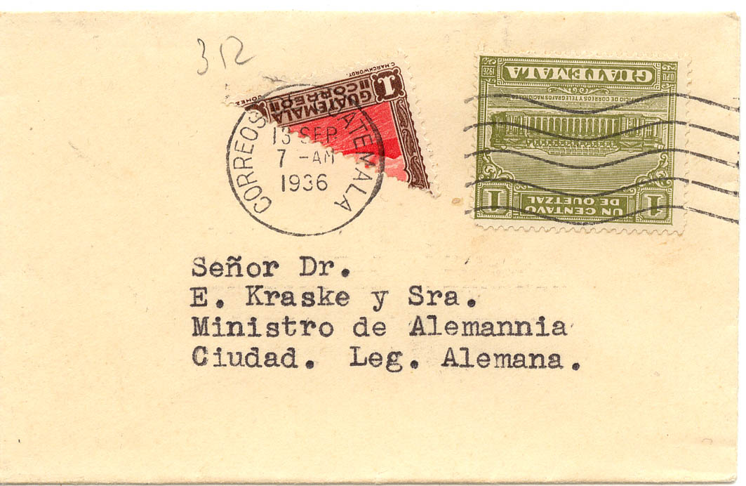 - Guatemala Zwangszuschalgsmarke für das zu errichden Zentralpostgebäude Mi.-Nr. 2 und Mi.-Nr. 293 Freimarke Ausgabe der MiNr. 288 diagonal durch Perforation halbiert, 115 * 67