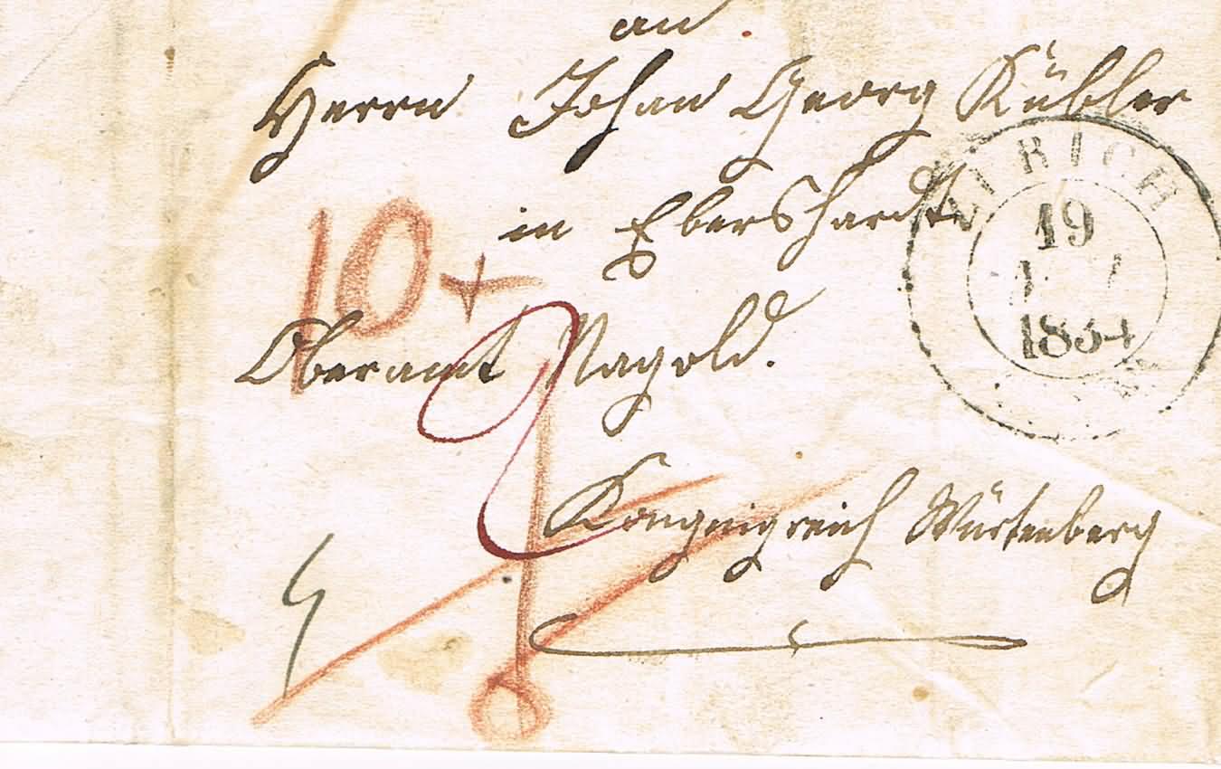 Ich bin da etwas am Zweifeln. Der Brief ist 3 Seiten stark und könnte 2. Gewichtsstufe, mehr als ½ Loth sein. Das würde ich dann so deuten: zunächst wurden 3Kr für St. Gallen notiert, dann aber das höhere Gewicht bemerkt und auf 6Kr korrigiert. Die badischen 3Kr müssten passen für ½ – 1 Loth. Was meinen die Experten dazu?