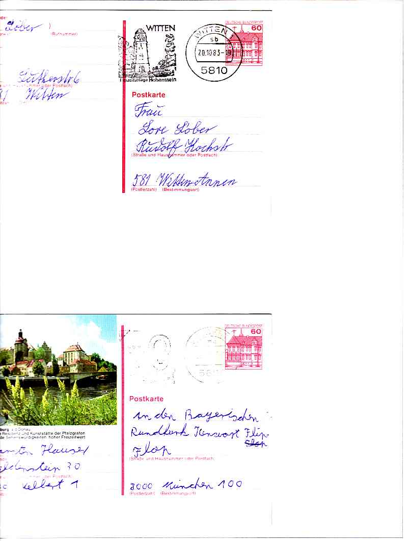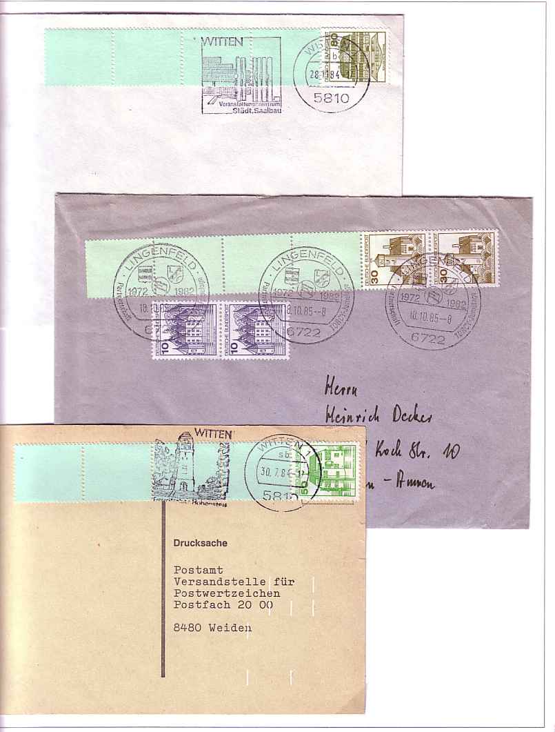 In der Folge will ich einige Belege zeigen, die mit Freimarken der Serie Burgen und Schlösser freigemacht worden sind.