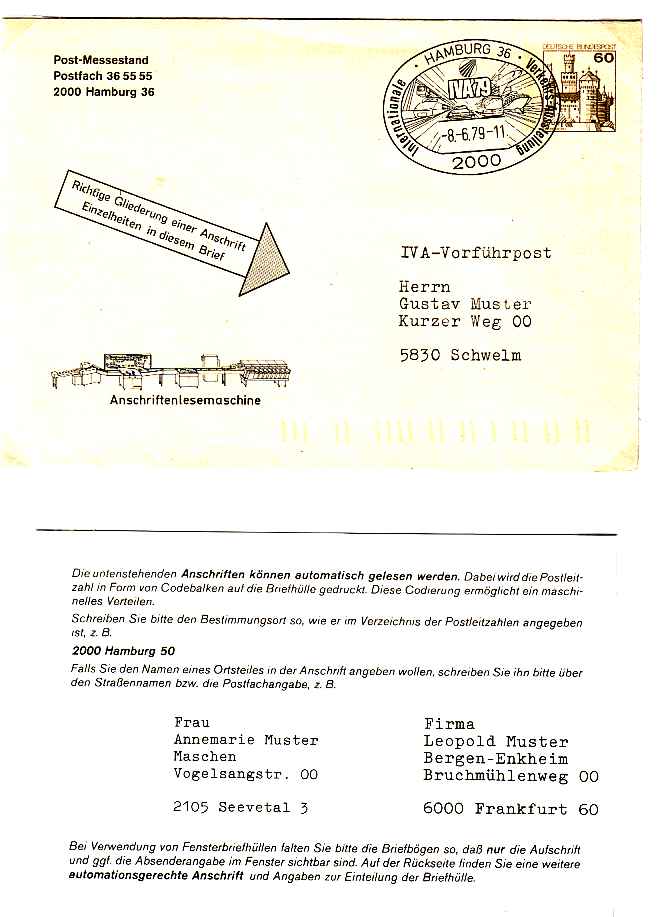 Vielleicht etwas verspätet noch eine Präzisierung zu der Ganzsache mit der Werbung für die Anschriftenform: es handelt sich hierbei nicht um ein Postwertzeichen, denn diese und Varianten dieser Ganzsache wurden ausschließlich zu Demonstrationszwecken auf der IVA verwendet und wurden nur gestempelt und nicht ungebraucht ans Publikum abgegeben.