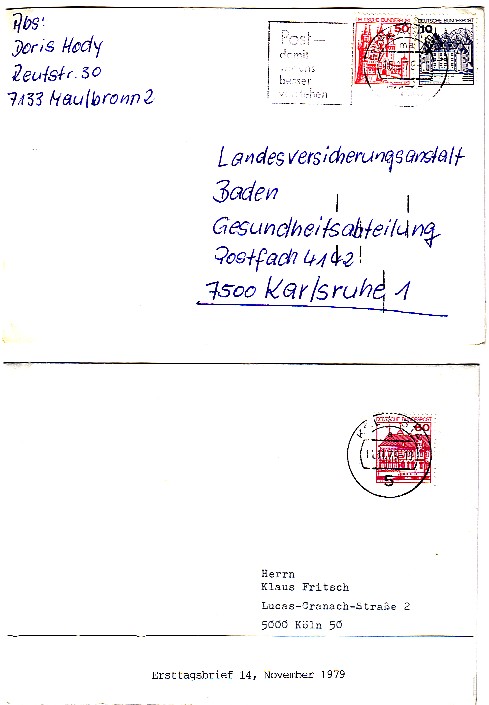 In der Folge will ich einige Belege zeigen, die mit Freimarken der Serie Burgen und Schlösser freigemacht worden sind.
