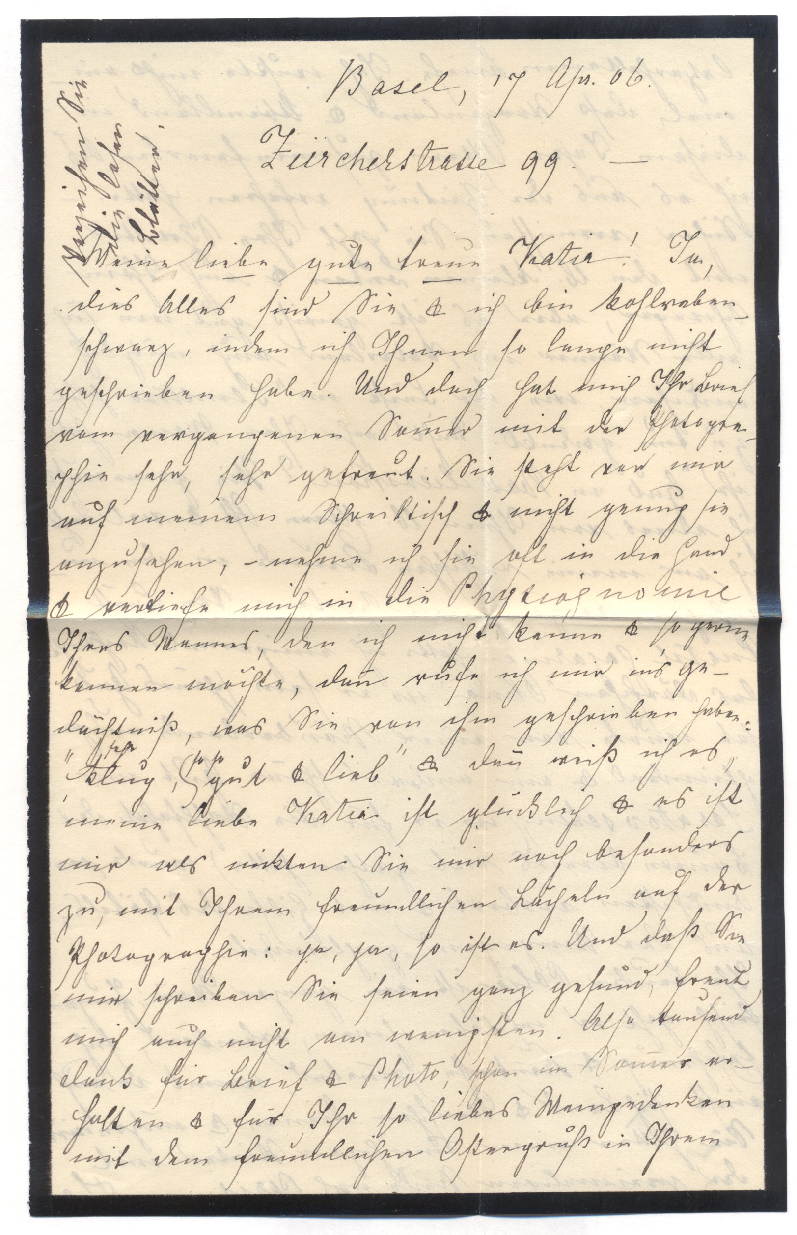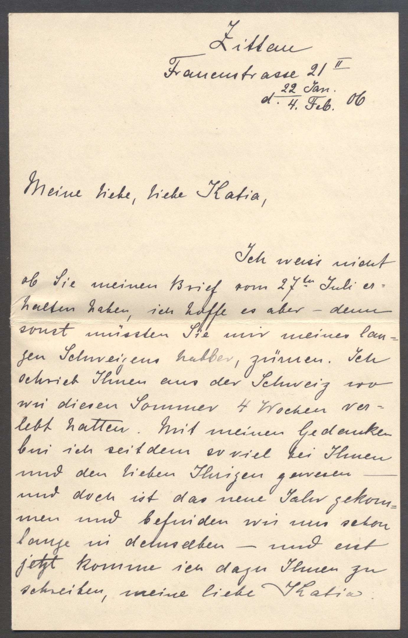 Ich weiss nicht ob Sie meinen Brief vom 27. Juli erhalten haben, ich hoffe es aber - denn sonst müssten Sie mir meines langen Schweigens halber, zürnen. Ich schrieb Ihnen aus der Schweiz, wo wir diesen Sommer 4 Wochen verlebt hatten. Mit meinen Gedanken bin ich seit dem so viel bei Ihnnen und den lieben Ihrigen gewesen - und doch ist das neue Jahr gekommen und befinden wir uns schon lange in demselben - und erst jetzt komme ich dazu Ihnen zu schreiben, meine liebe Katia.