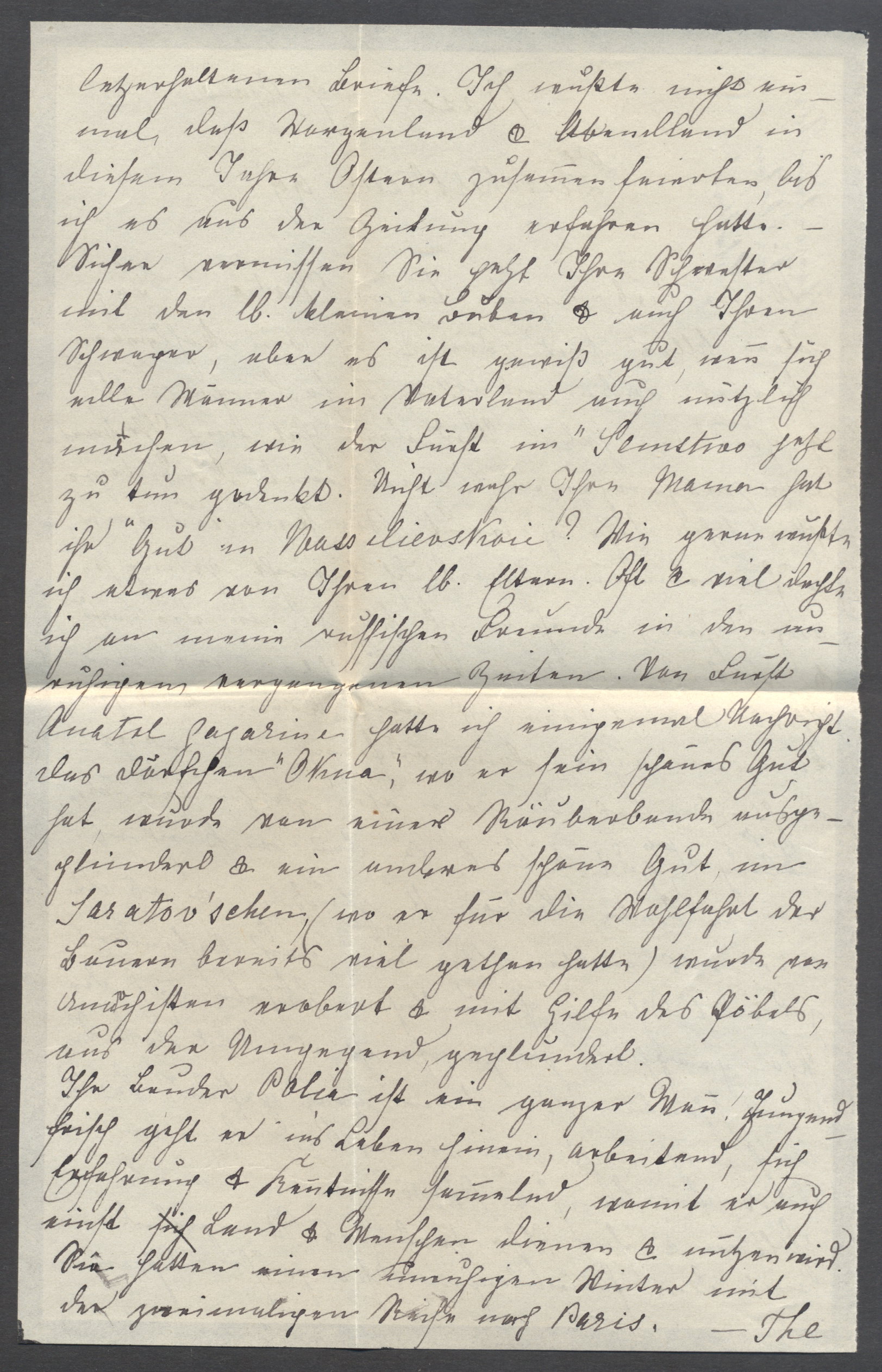 letzterhaltenen Briefe. Ich wüßte nicht einmal, daß Morgenland & Abendland in diesem Jahre Ostern zusammen feierten, bis ich es aus der Zeitung erfahren hatte. – Sicher vermissen Sie jetzt Ihre Schwester mit den lb. Kleinen Buben & auch Ihren Schwager, aber es ist gewiß gut, wenn sich alle Männer im Vaterland auch nützlich machen, wie der Fürst im „Semstivo (?) jetzt zu tun gedenkt. Nicht wahr Ihre Mama hat ihr „Gut“ in Wassilievskoie? Wie gerne wüsste ich etwas von Ihren lb. Eltern. Oft & viel dachte ich an meine russischen Freunde in den unruhigen vergangenen Zeiten. Von Fürst Anatol Gagarin hatte ich einige Mal Nachricht das das Dörfchen „Okno“, wo er sein schönes Gut hat, wurde von einer Räuberbande ausgeplündert & ein anderes schönes Gut, im Saratov’schen, (wo er für die Wohlfahrt der Bauern bereits viel gethan hatte) wurde von Anarchisten erobert & mit Hilfe des Pöbels, aus der Umgegend, geplündert.