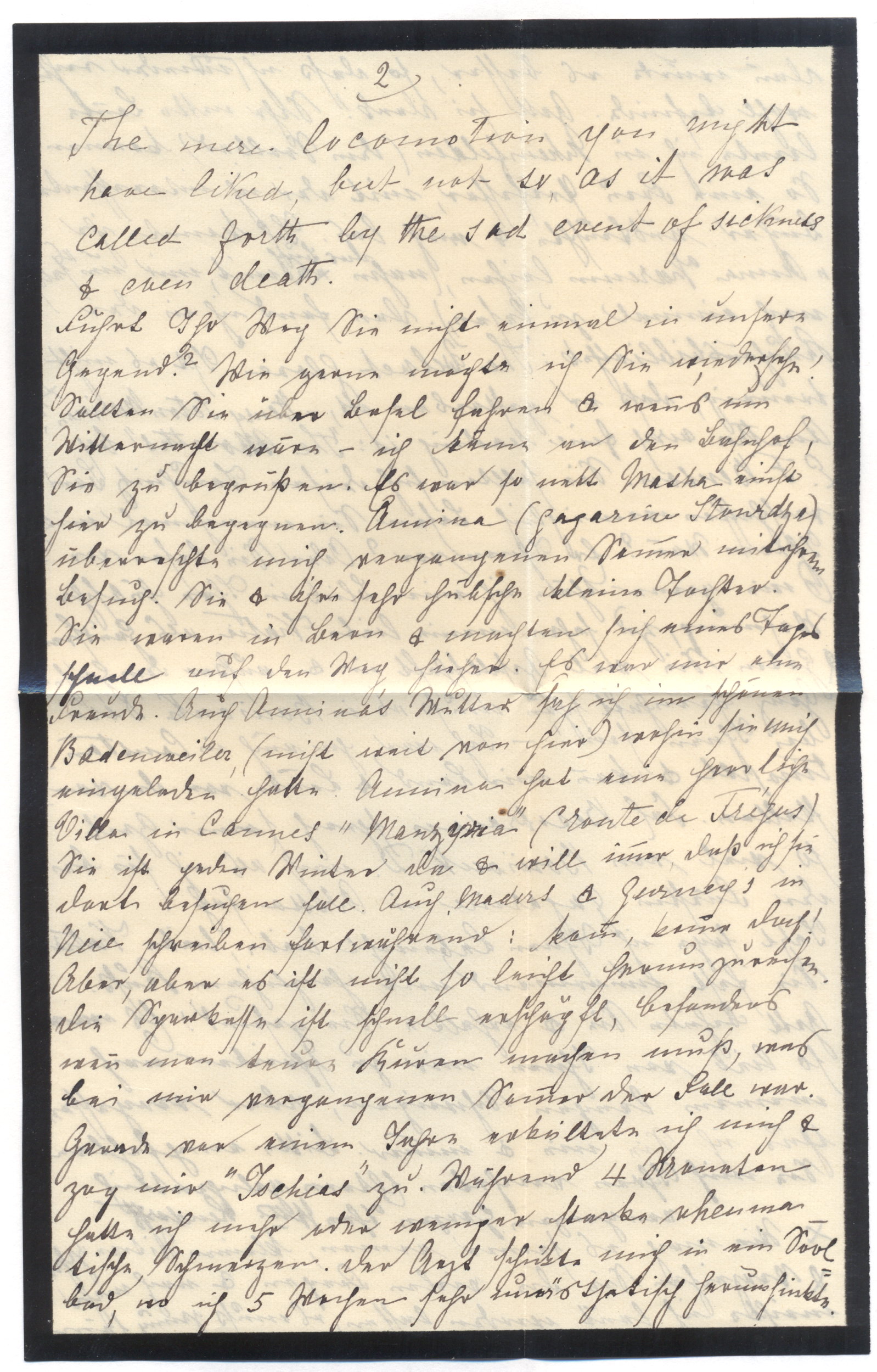 Dann wurde es besser, so daß ich mich wieder recht wohl befinde. Gott sei Dank! Sehr nette Leute lernte ich in Rheinfelden (dem Soolbad) kennen. So eine Frau Professor, mit der ich interessante Bücher austauschte & auch las. Ich konnte ihr „Anna Karenina“ leihen, nahm das Buch mit, nur um es selbst noch einmal zu lesen. Dann fand ich in der Kurhausbibliothek: „The Velvet Glove“. Ist es nicht traurig, daß er gestorben ist – Henry Seton Merriman? Another very fine reading is: „The Months“ by E.F. Benson. Sie sollten sich diesen xxx Band verschaffen wo möglich. Lesen Sie manchmal mit Ihrem Mann? Er Ihnen vor? Oder Sie lesen vor? O wie gerne thäte ich einen Blick in Ihre hübsche Wohnung, zu sehen meine liebe Katia als Hausfrau. Haben Sie viel Gesellschaft in & außer dem Hause? Ganz frauhaft (?) schön muß es in Bouionk Déré bei Ihnen sein! – Ich war, ja auch in Constantinopel & kann mir Land & Leute von da vorstellen. Frl. Besebratero (?) sprach seiner Zeit so viel von Bouionk D. noch als ich sie bei der Fürstin Gagarin in Odessa sah!